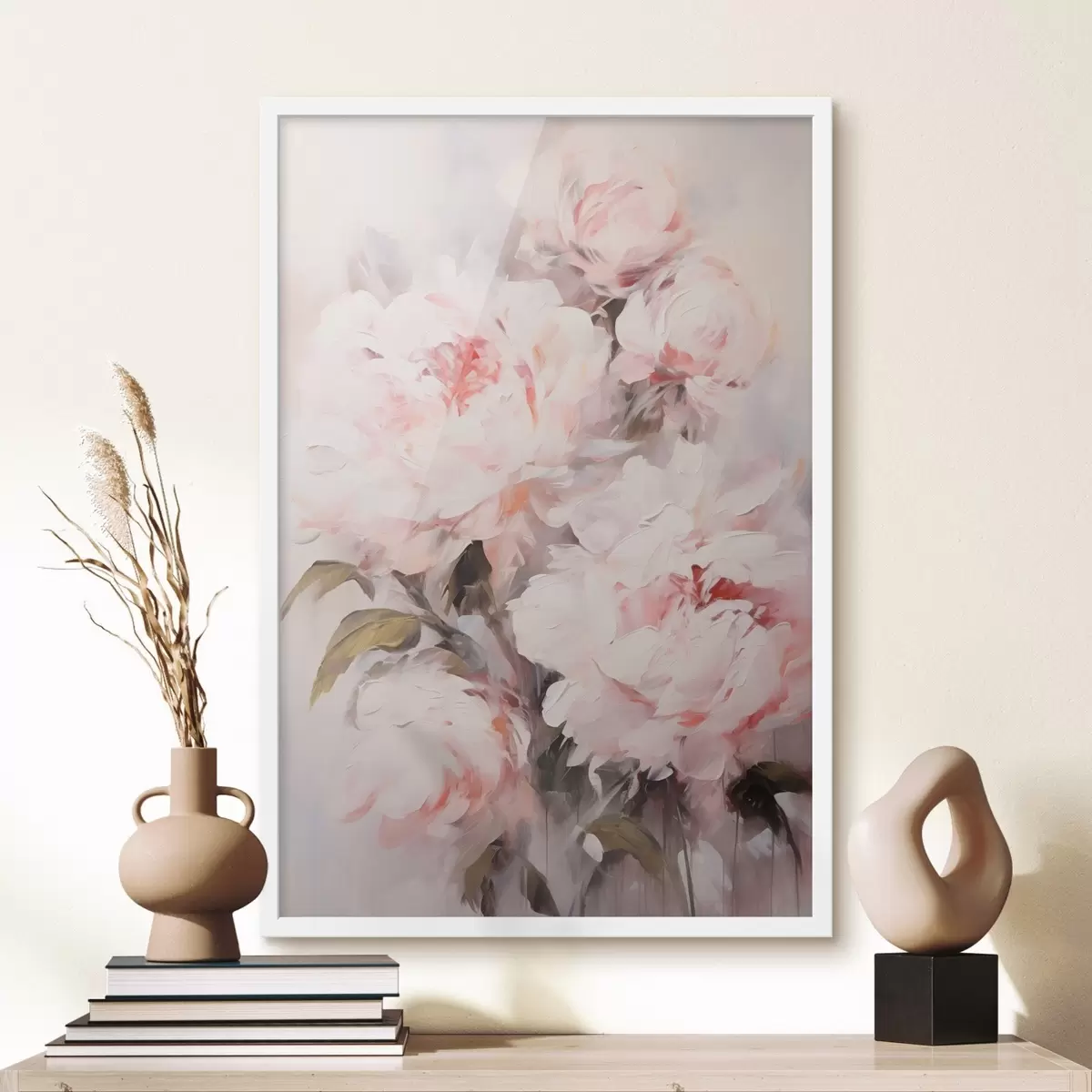Poster Ein Strauß hellrosa Pfingstrosen mit grünen Blättern, sanfte Pinselstriche, Pastellfarben, auf hellem Hintergrund Nr f46294