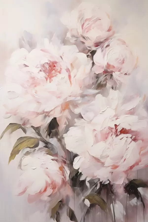 Poster Ein Strauß hellrosa Pfingstrosen mit grünen Blättern, sanfte Pinselstriche, Pastellfarben, auf hellem Hintergrund Nr f46294