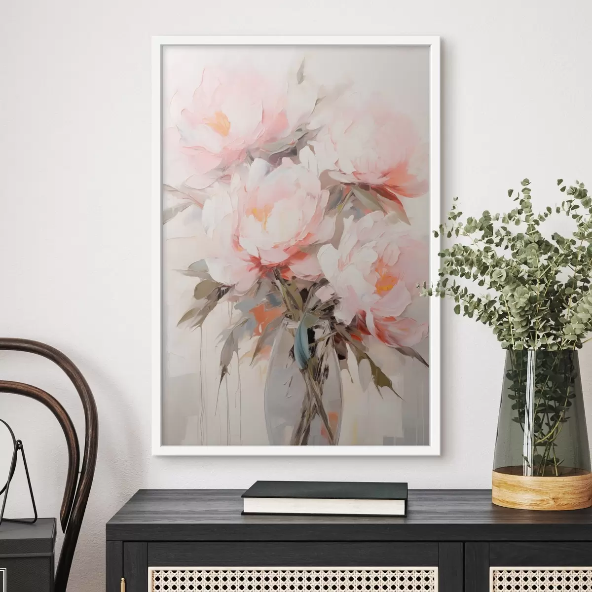 Poster Ein Strauß aus rosa und weißen Pfingstrosen in einer Glasvase, sanfte Pinselstriche, Pastellfarben, neutraler Hintergrund f46295