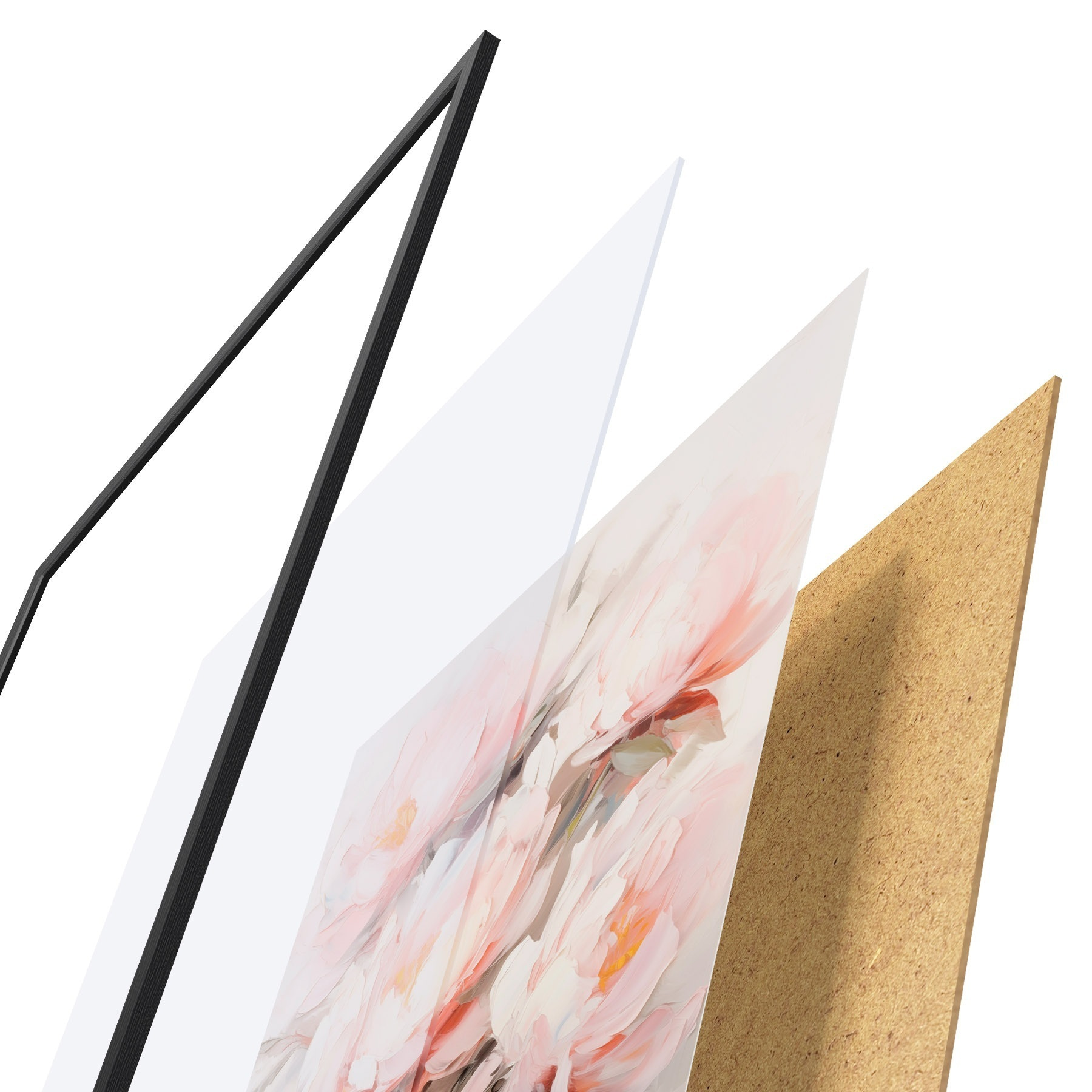 Das Poster besteht aus einem Rahmen, Plexiglas, einem gedruckten Bild und einer Rückwand aus Spanplatten. Dank der Halterungen auf der Rückseite kann das Poster sofort an die Wand gehängt werden.