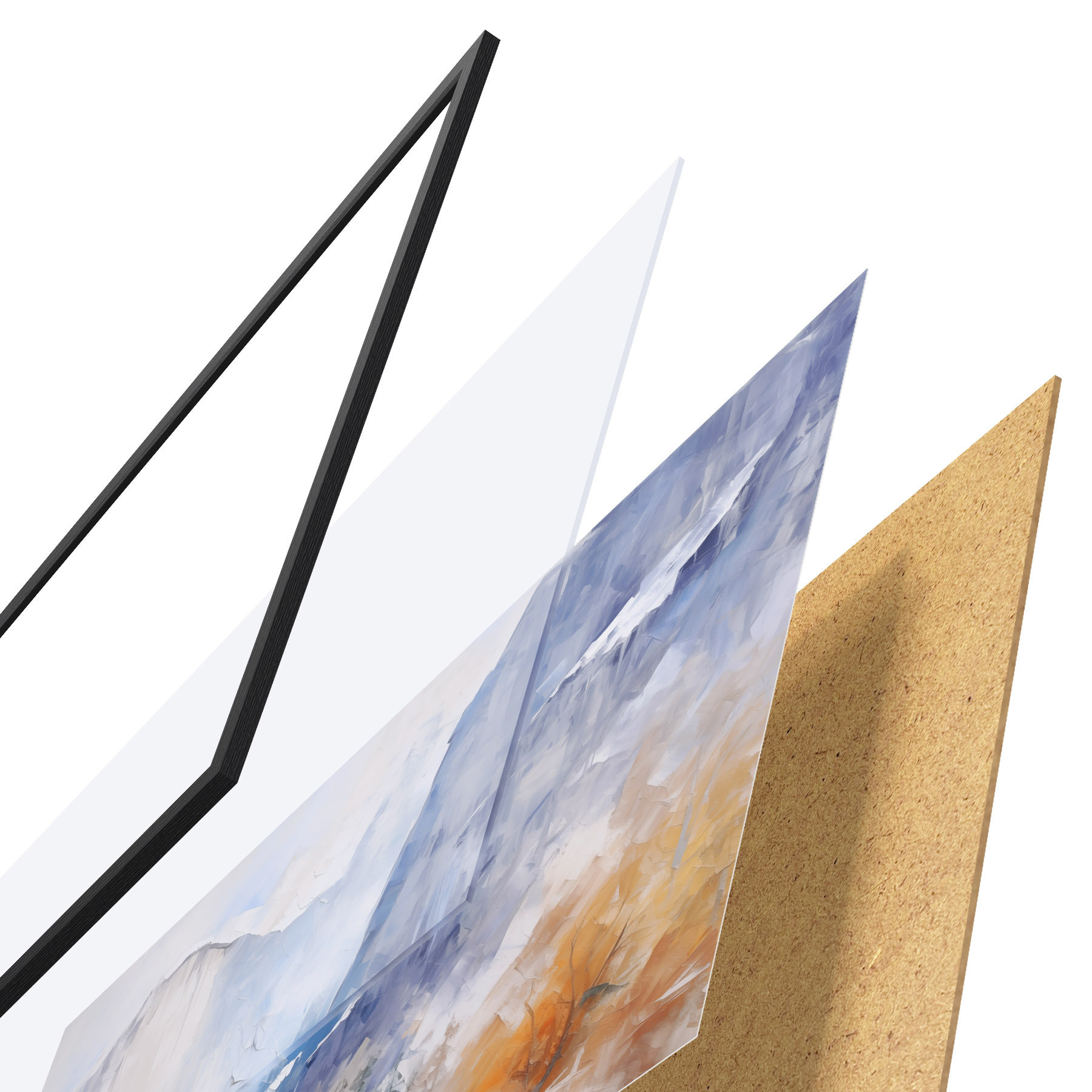 Das Poster besteht aus einem Rahmen, Plexiglas, einem gedruckten Bild und einer Rückwand aus Spanplatten. Dank der Halterungen auf der Rückseite kann das Poster sofort an die Wand gehängt werden.