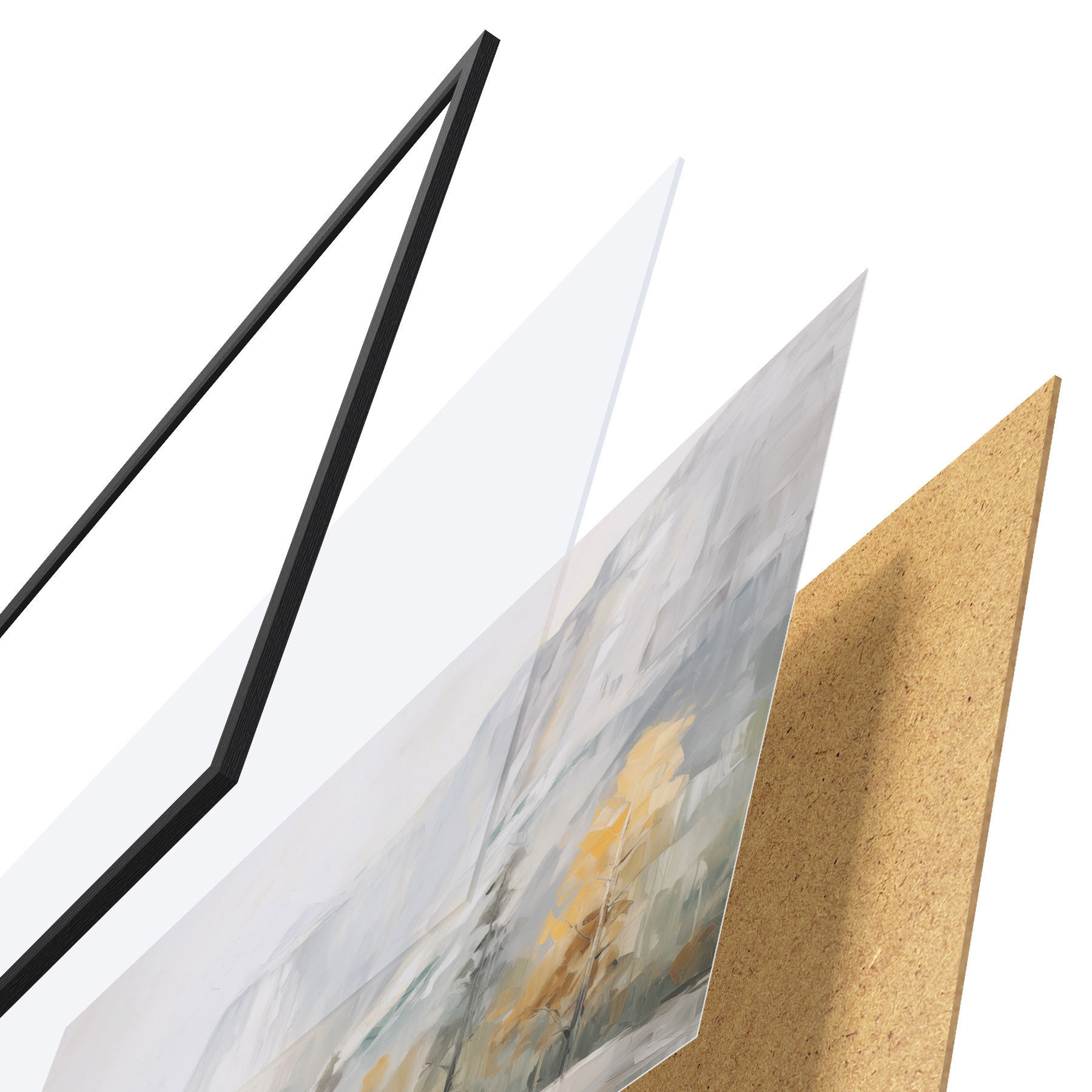Das Poster besteht aus einem Rahmen, Plexiglas, einem gedruckten Bild und einer Rückwand aus Spanplatten. Dank der Halterungen auf der Rückseite kann das Poster sofort an die Wand gehängt werden.