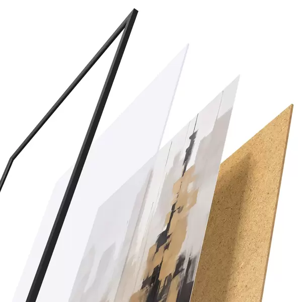 Das Poster besteht aus einem Rahmen, Plexiglas, einem gedruckten Bild und einer Rückwand aus Spanplatten. Dank der Halterungen auf der Rückseite kann das Poster sofort an die Wand gehängt werden.