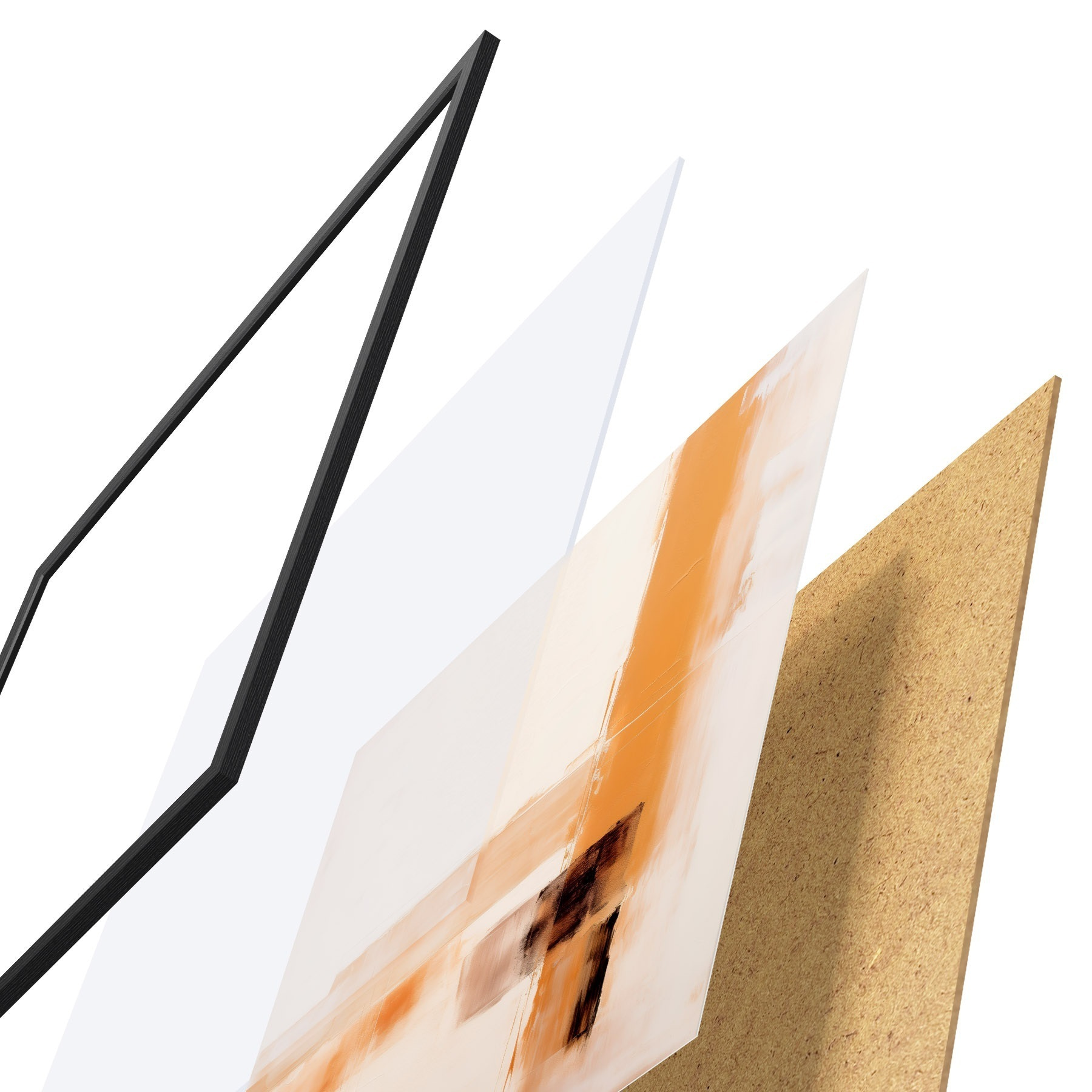 Das Poster besteht aus einem Rahmen, Plexiglas, einem gedruckten Bild und einer Rückwand aus Spanplatten. Dank der Halterungen auf der Rückseite kann das Poster sofort an die Wand gehängt werden.