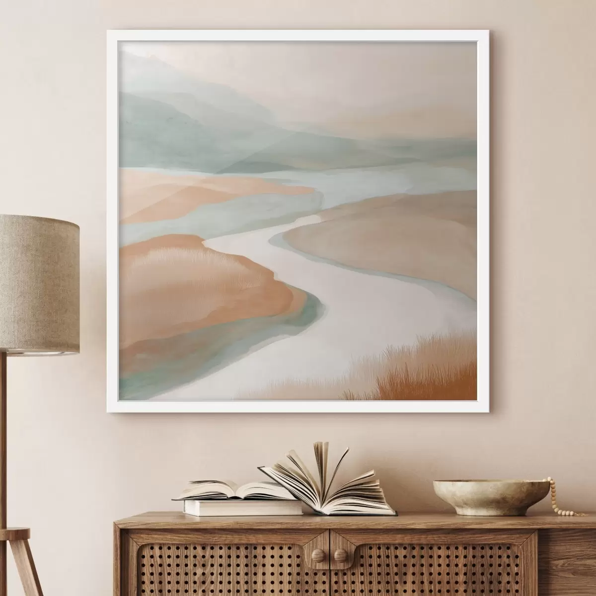 Poster Abstrakte Landschaft mit einem Fluss in Orange und Grün f46316