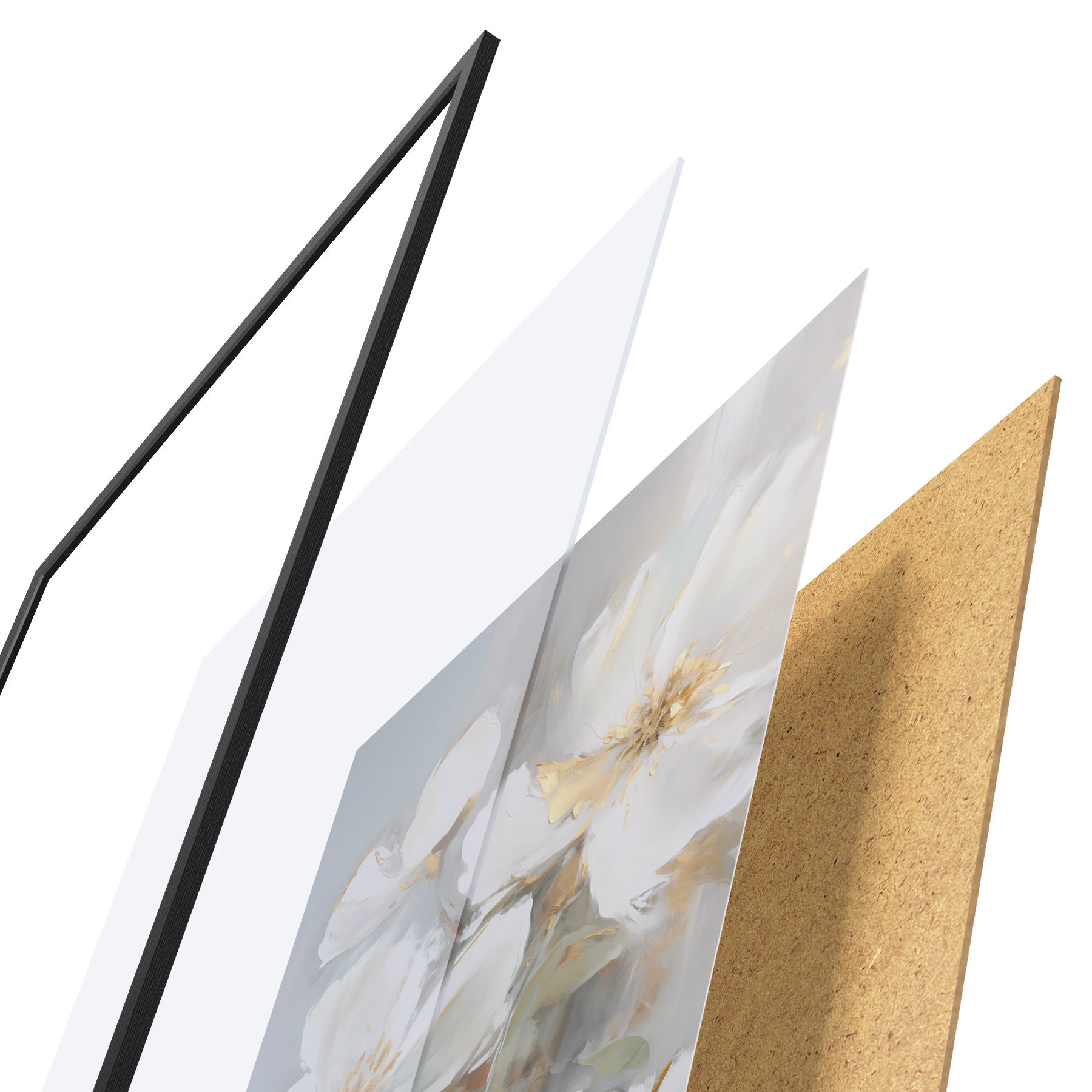 Das Poster besteht aus einem Rahmen, Plexiglas, einem gedruckten Bild und einer Rückwand aus Spanplatten. Dank der Halterungen auf der Rückseite kann das Poster sofort an die Wand gehängt werden.