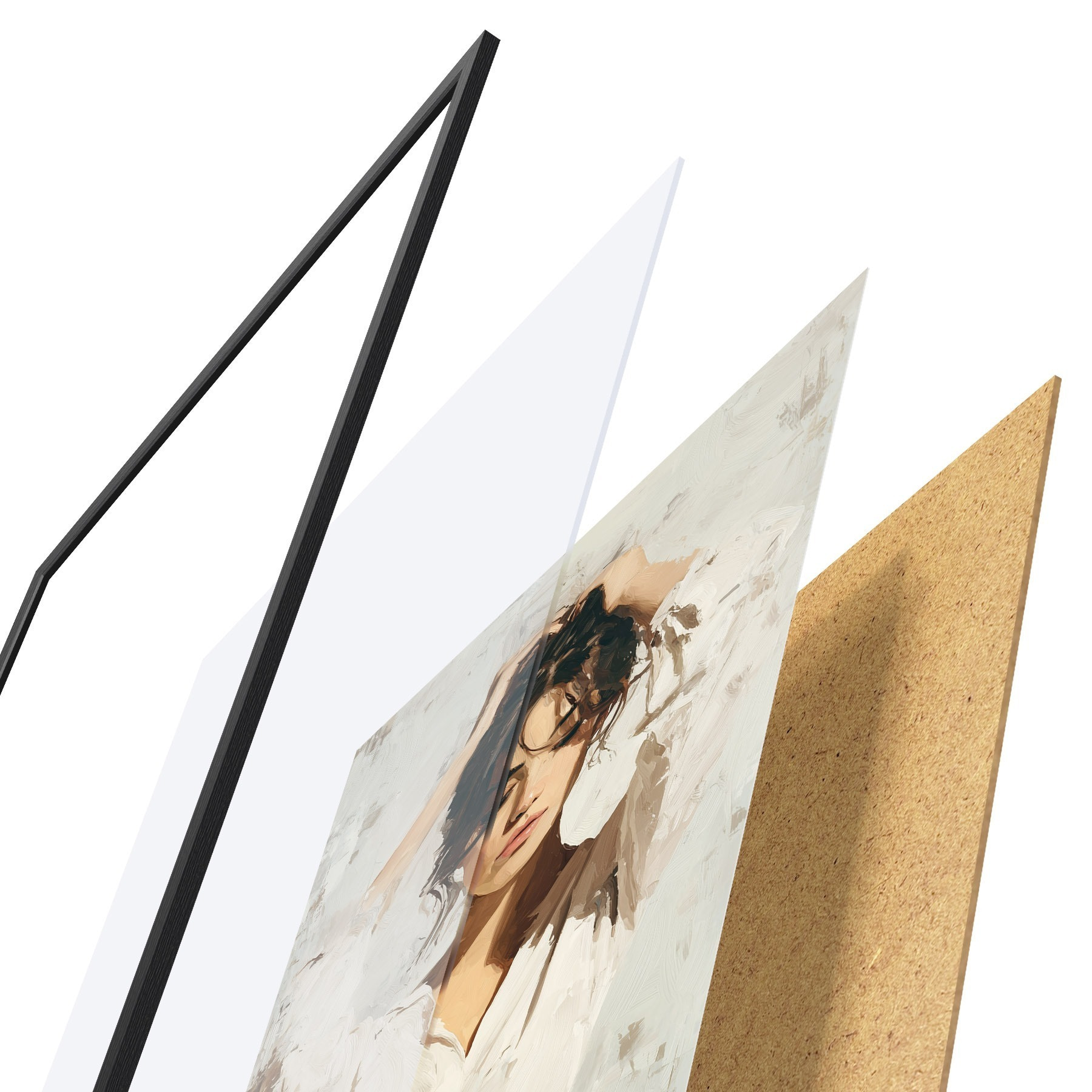 Das Poster besteht aus einem Rahmen, Plexiglas, einem gedruckten Bild und einer Rückwand aus Spanplatten. Dank der Halterungen auf der Rückseite kann das Poster sofort an die Wand gehängt werden.