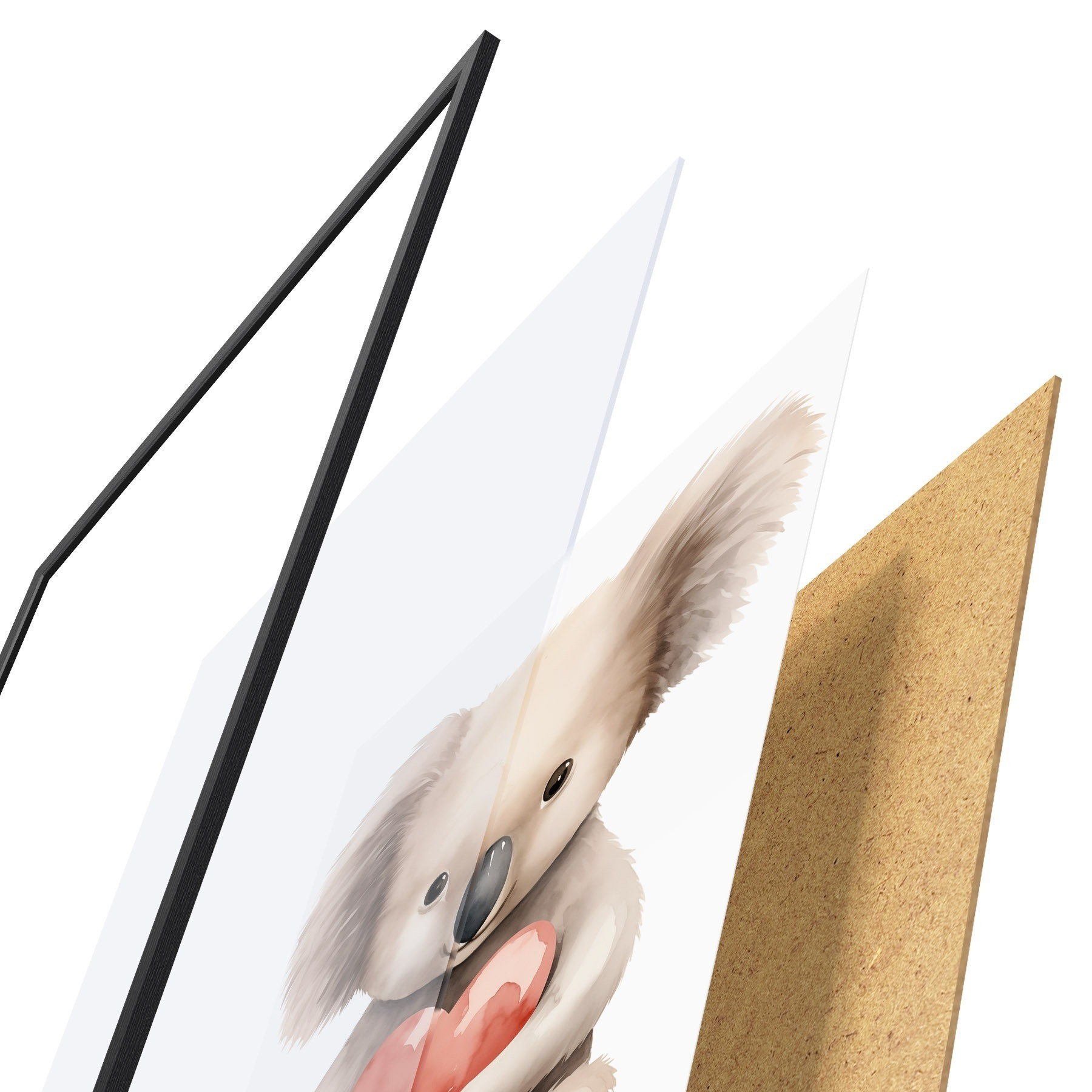 Das Poster besteht aus einem Rahmen, Plexiglas, einem gedruckten Bild und einer Rückwand aus Spanplatten. Dank der Halterungen auf der Rückseite kann das Poster sofort an die Wand gehängt werden.