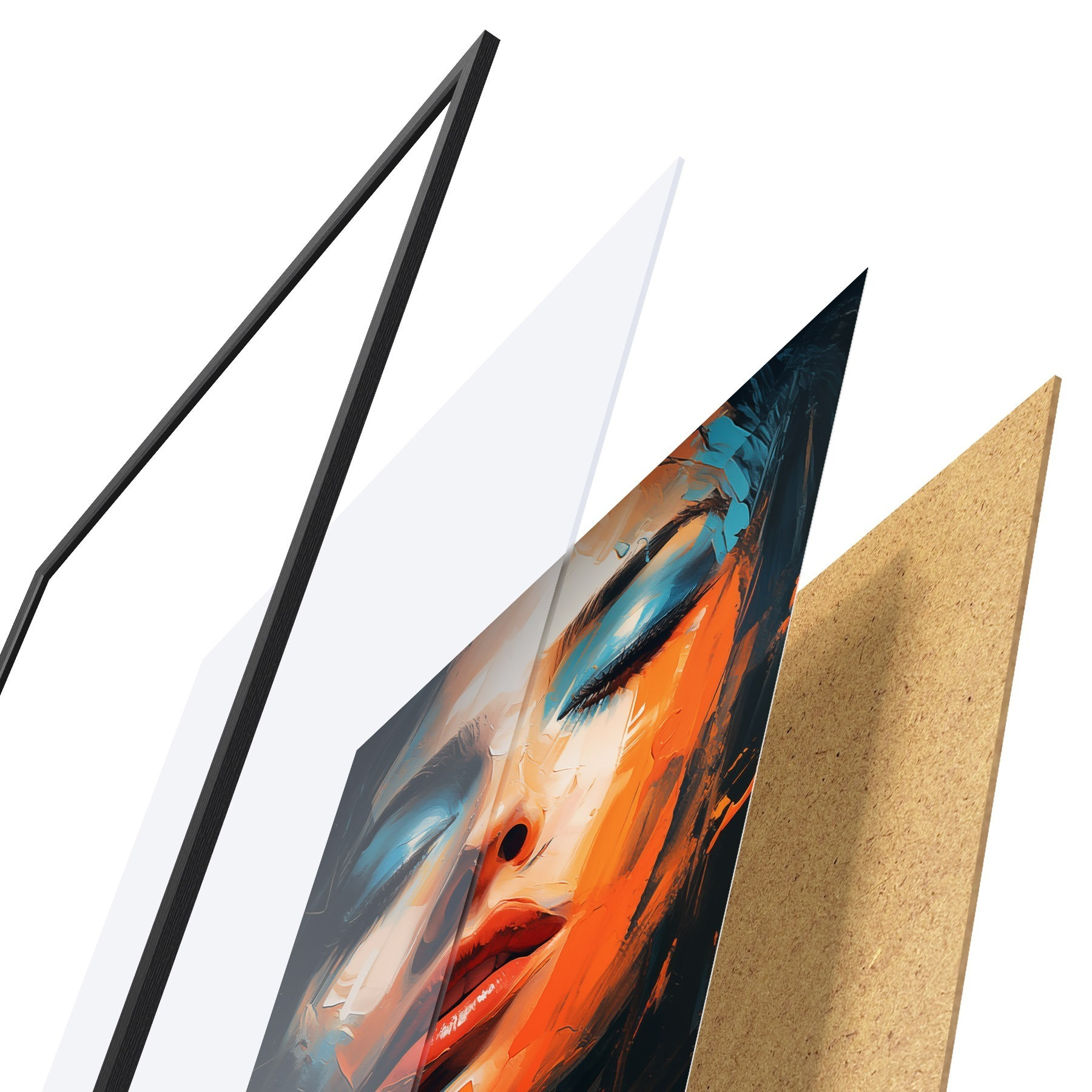 Das Poster besteht aus einem Rahmen, Plexiglas, einem gedruckten Bild und einer Rückwand aus Spanplatten. Dank der Halterungen auf der Rückseite kann das Poster sofort an die Wand gehängt werden.
