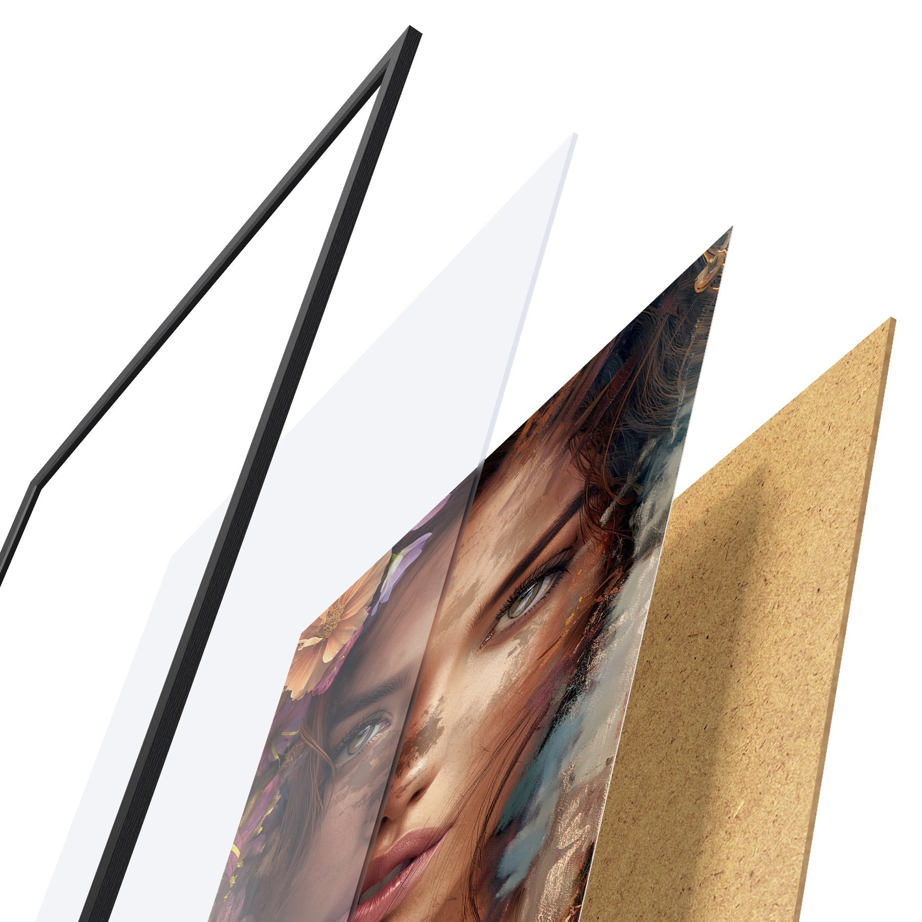 Das Poster besteht aus einem Rahmen, Plexiglas, einem gedruckten Bild und einer Rückwand aus Spanplatten. Dank der Halterungen auf der Rückseite kann das Poster sofort an die Wand gehängt werden.