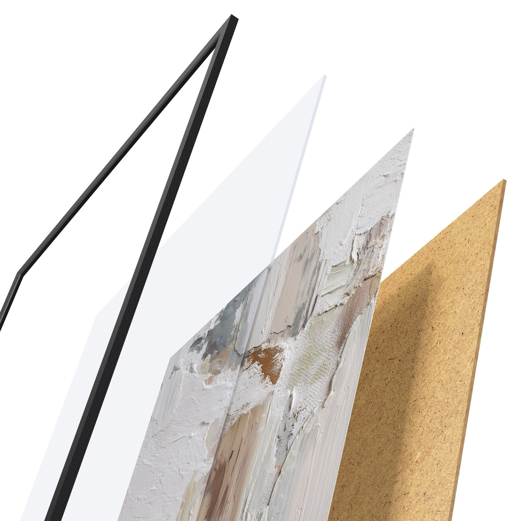 Das Poster besteht aus einem Rahmen, Plexiglas, einem gedruckten Bild und einer Rückwand aus Spanplatten. Dank der Halterungen auf der Rückseite kann das Poster sofort an die Wand gehängt werden.