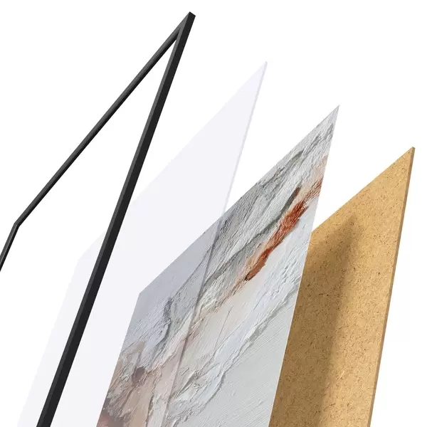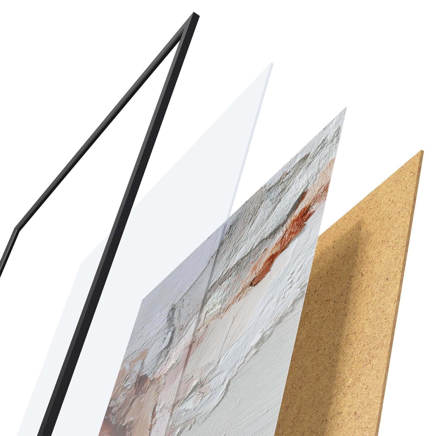 Das Poster besteht aus einem Rahmen, Plexiglas, einem gedruckten Bild und einer Rückwand aus Spanplatten. Dank der Halterungen auf der Rückseite kann das Poster sofort an die Wand gehängt werden.