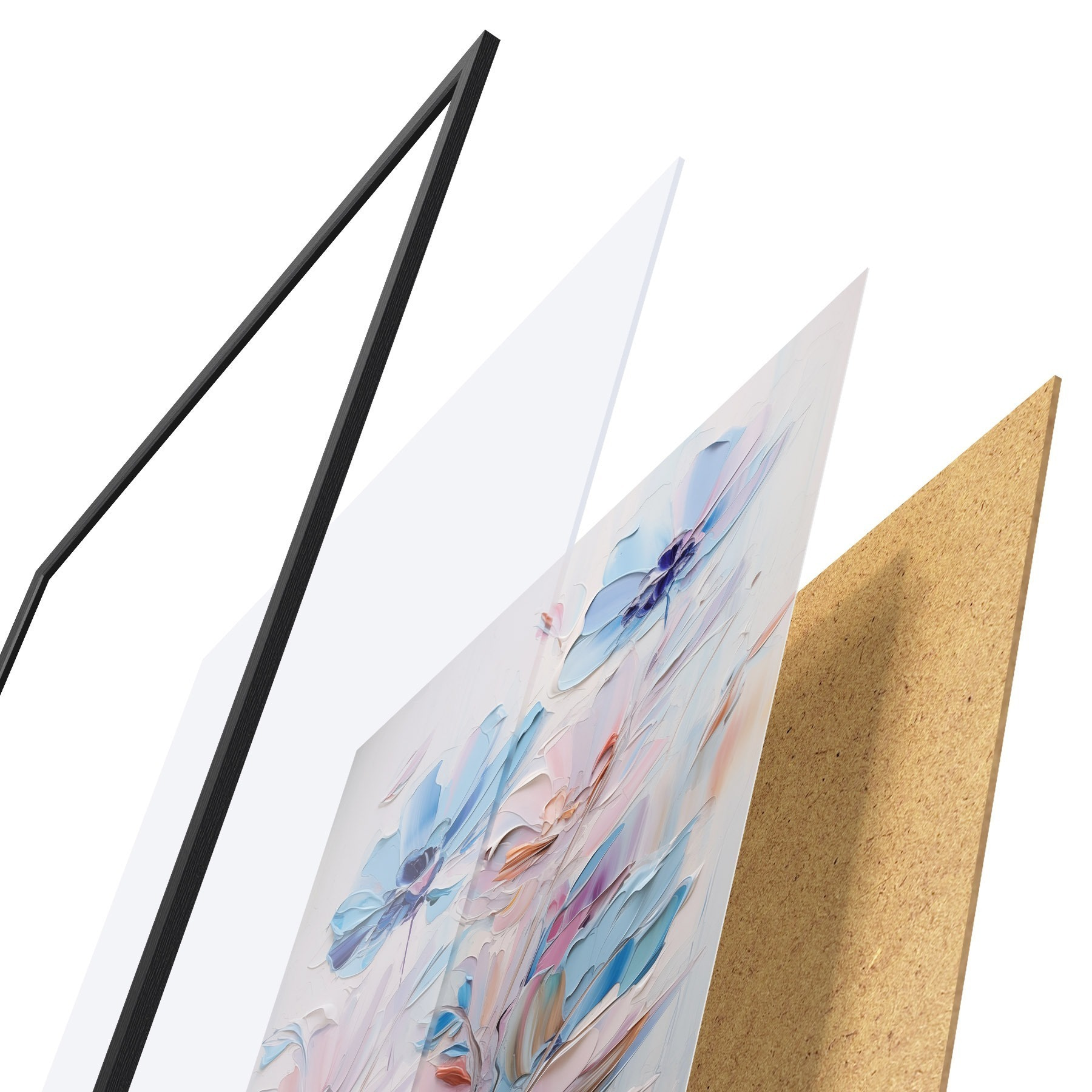 Das Poster besteht aus einem Rahmen, Plexiglas, einem gedruckten Bild und einer Rückwand aus Spanplatten. Dank der Halterungen auf der Rückseite kann das Poster sofort an die Wand gehängt werden.
