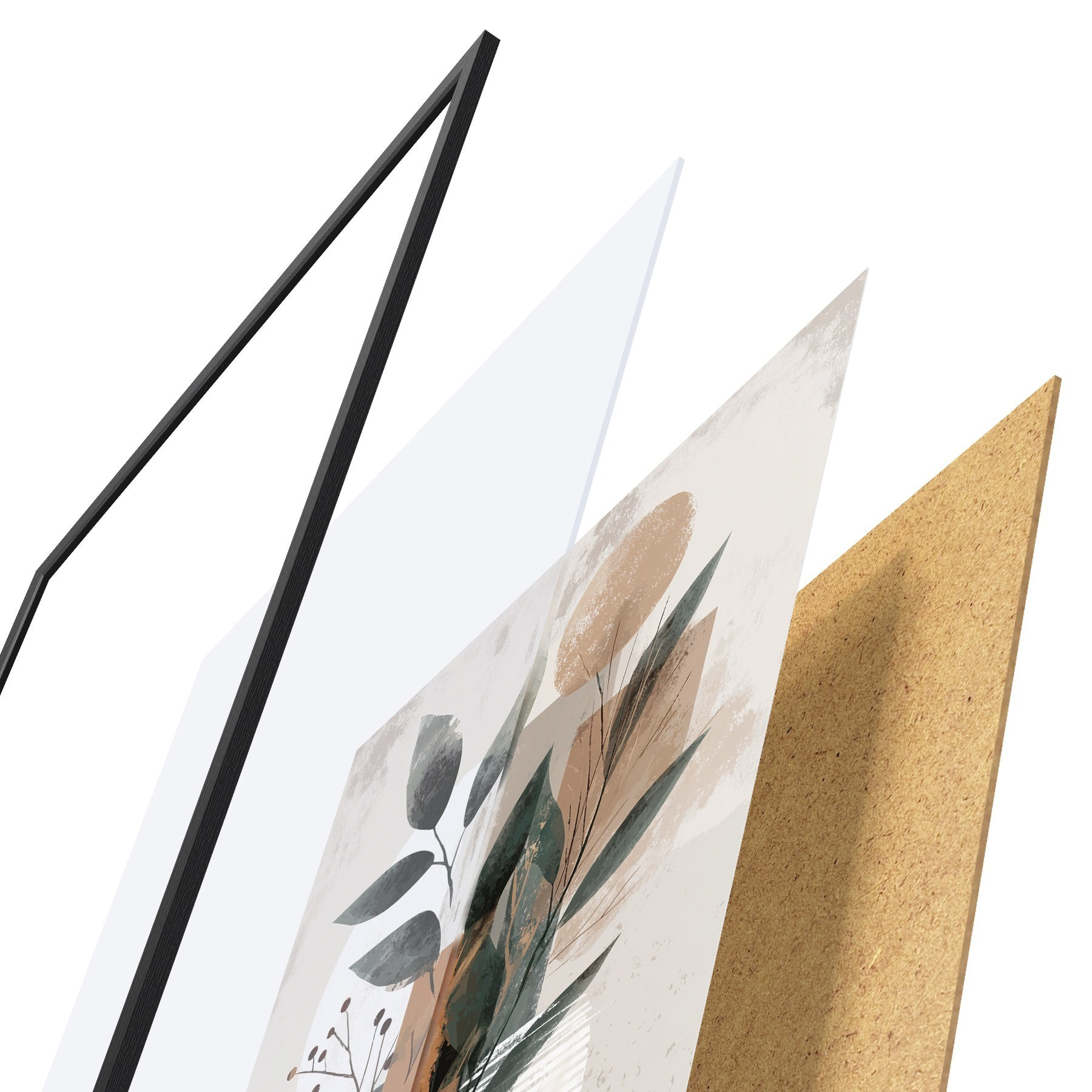 Das Poster besteht aus einem Rahmen, Plexiglas, einem gedruckten Bild und einer Rückwand aus Spanplatten. Dank der Halterungen auf der Rückseite kann das Poster sofort an die Wand gehängt werden.