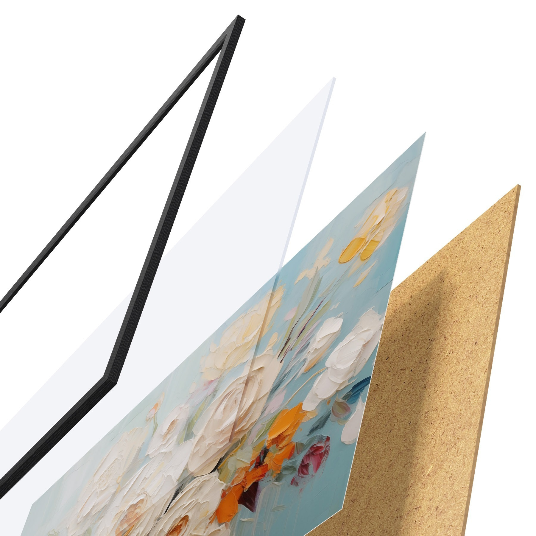 Das Poster besteht aus einem Rahmen, Plexiglas, einem gedruckten Bild und einer Rückwand aus Spanplatten. Dank der Halterungen auf der Rückseite kann das Poster sofort an die Wand gehängt werden.