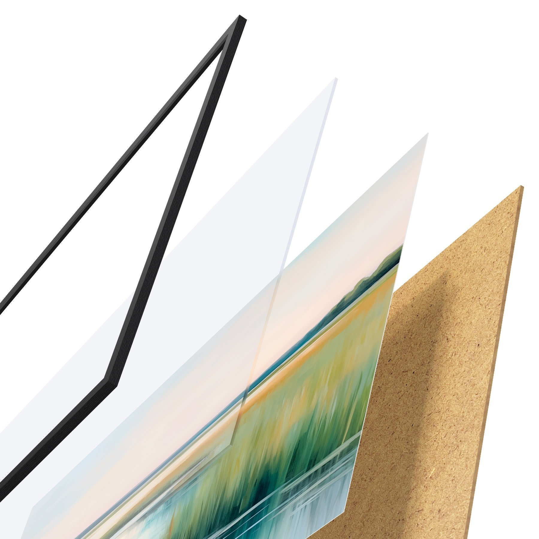 Das Poster besteht aus einem Rahmen, Plexiglas, einem gedruckten Bild und einer Rückwand aus Spanplatten. Dank der Halterungen auf der Rückseite kann das Poster sofort an die Wand gehängt werden.