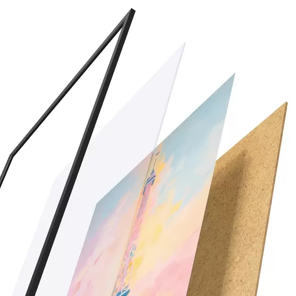 Das Poster besteht aus einem Rahmen, Plexiglas, einem gedruckten Bild und einer Rückwand aus Spanplatten. Dank der Halterungen auf der Rückseite kann das Poster sofort an die Wand gehängt werden.