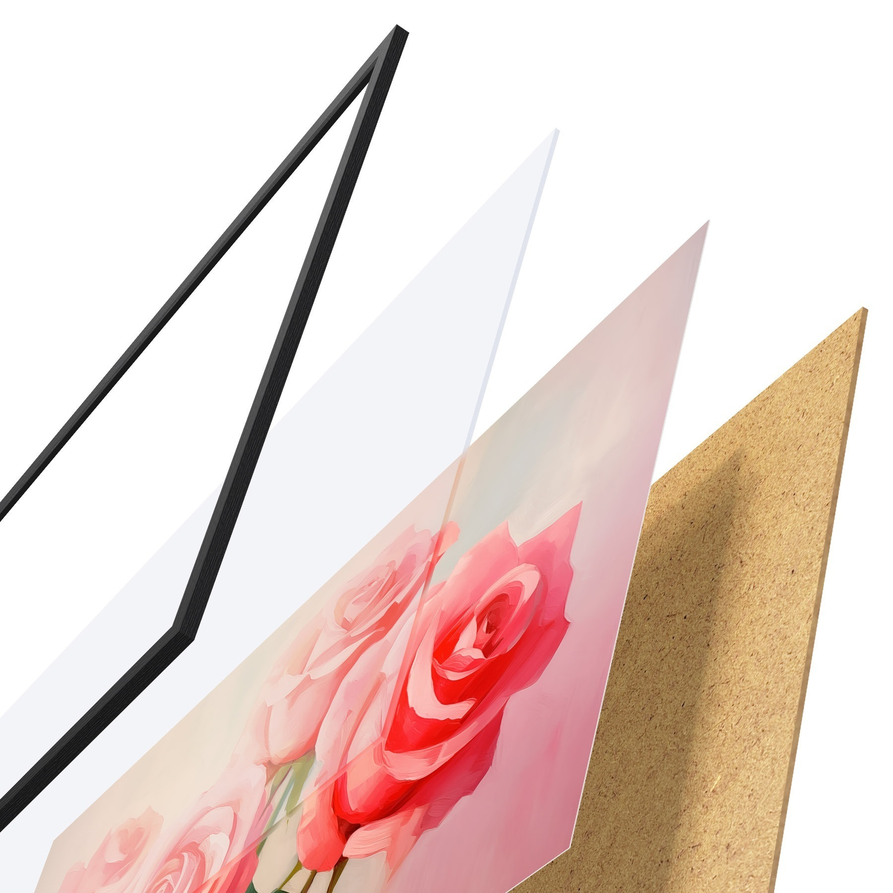 Das Poster besteht aus einem Rahmen, Plexiglas, einem gedruckten Bild und einer Rückwand aus Spanplatten. Dank der Halterungen auf der Rückseite kann das Poster sofort an die Wand gehängt werden.