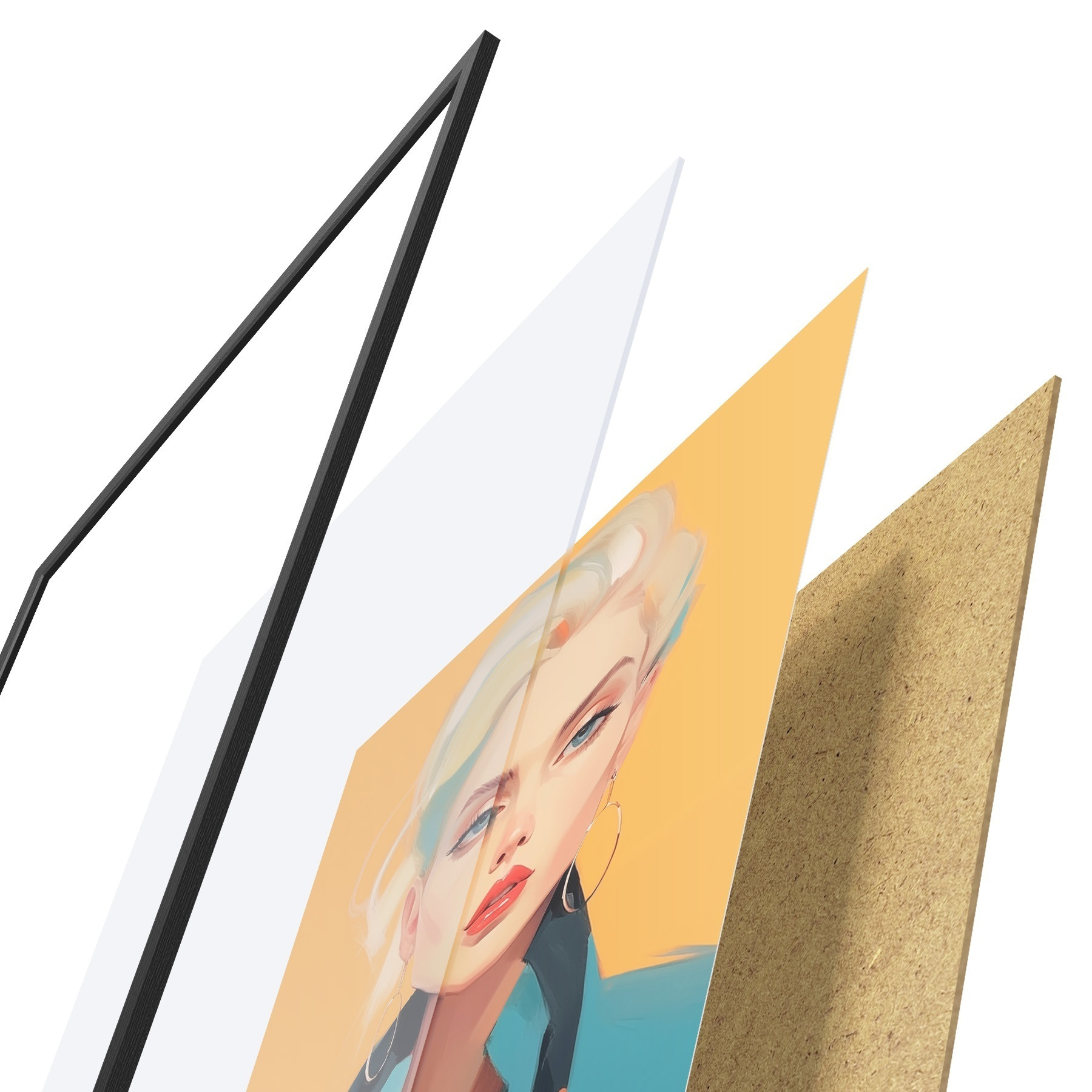 Das Poster besteht aus einem Rahmen, Plexiglas, einem gedruckten Bild und einer Rückwand aus Spanplatten. Dank der Halterungen auf der Rückseite kann das Poster sofort an die Wand gehängt werden.