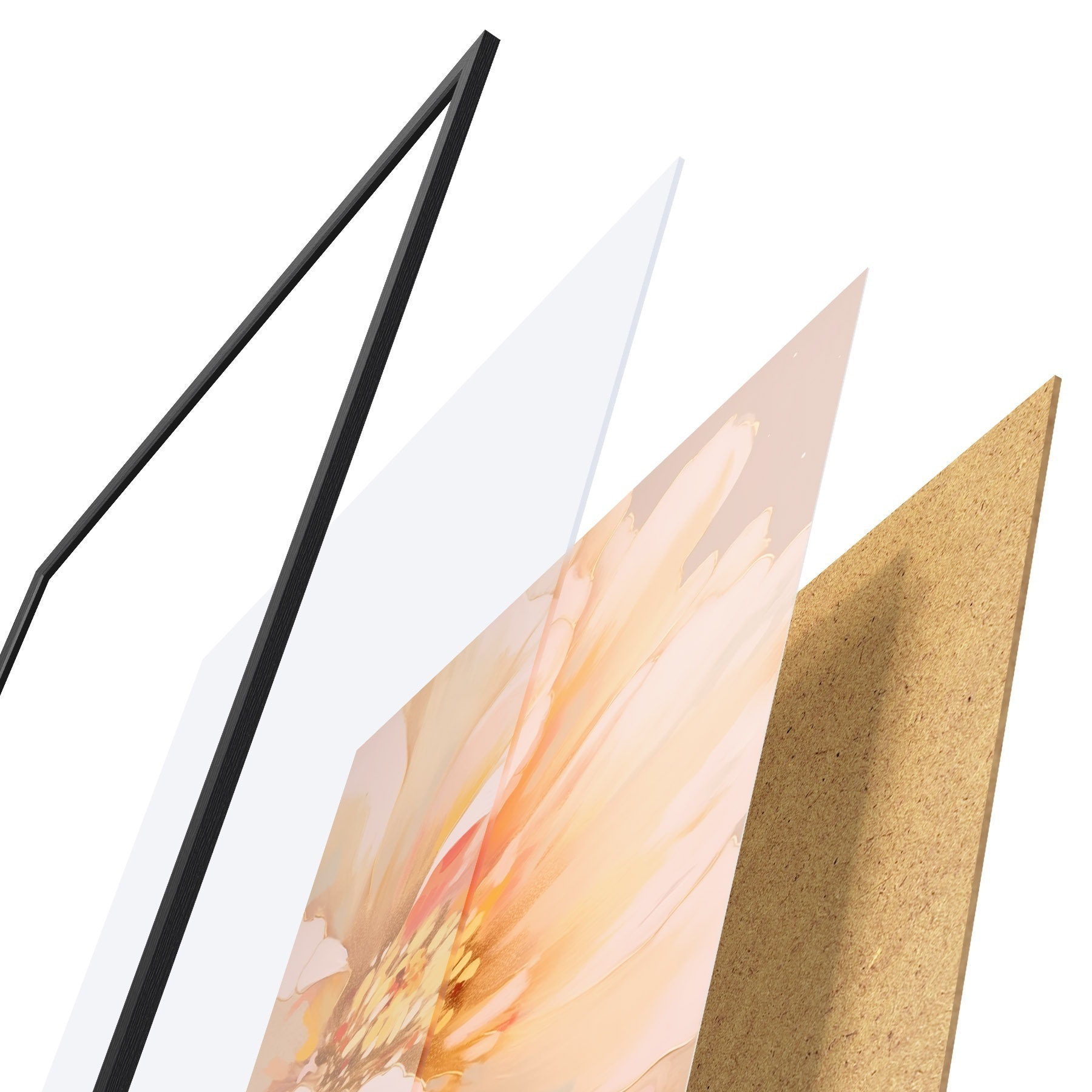 Das Poster besteht aus einem Rahmen, Plexiglas, einem gedruckten Bild und einer Rückwand aus Spanplatten. Dank der Halterungen auf der Rückseite kann das Poster sofort an die Wand gehängt werden.