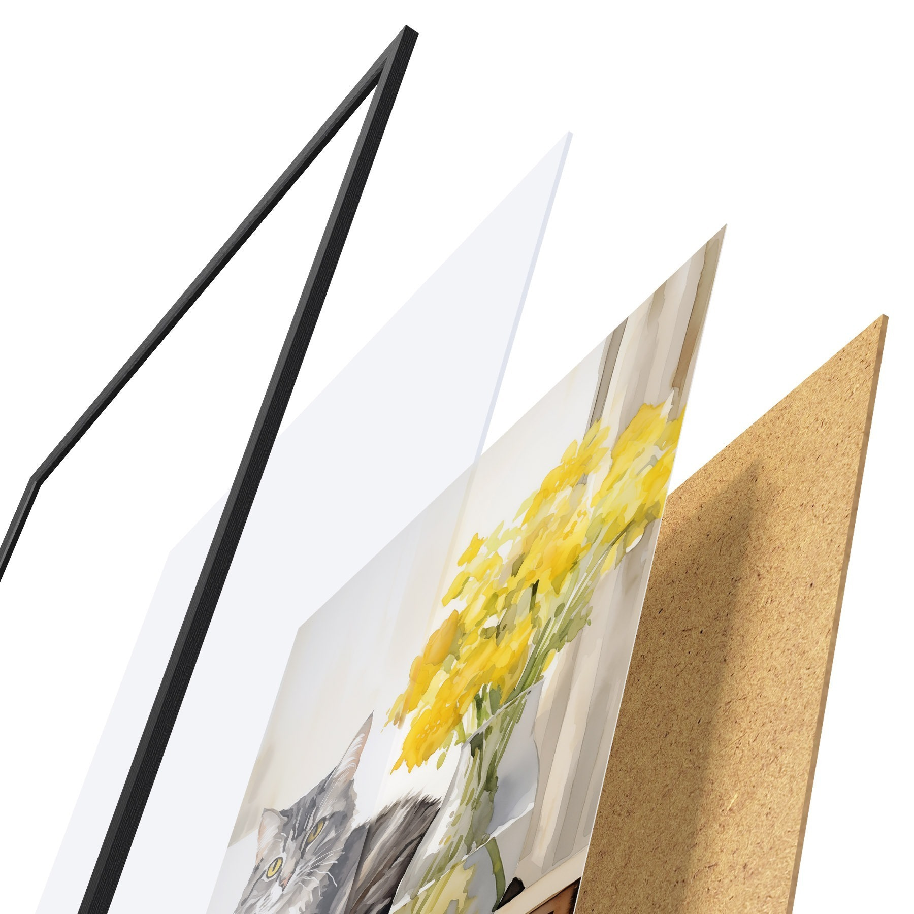 Das Poster besteht aus einem Rahmen, Plexiglas, einem gedruckten Bild und einer Rückwand aus Spanplatten. Dank der Halterungen auf der Rückseite kann das Poster sofort an die Wand gehängt werden.