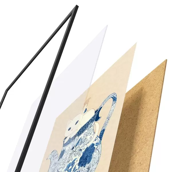 Das Poster besteht aus einem Rahmen, Plexiglas, einem gedruckten Bild und einer Rückwand aus Spanplatten. Dank der Halterungen auf der Rückseite kann das Poster sofort an die Wand gehängt werden.