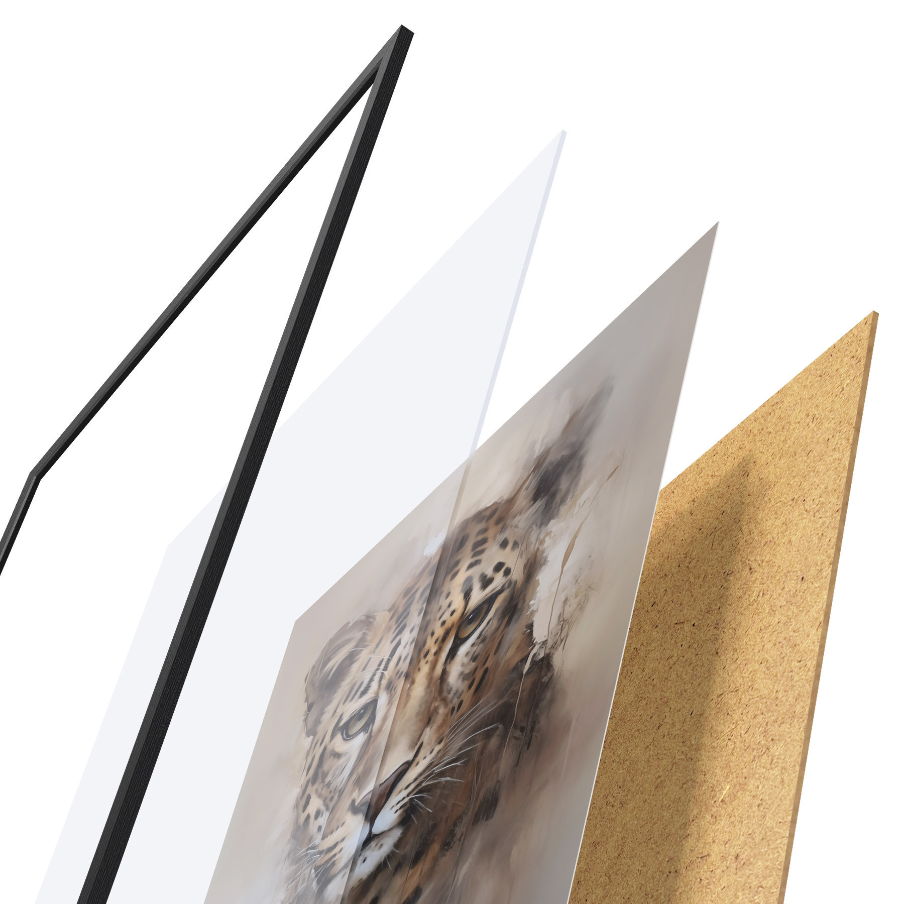 Das Poster besteht aus einem Rahmen, Plexiglas, einem gedruckten Bild und einer Rückwand aus Spanplatten. Dank der Halterungen auf der Rückseite kann das Poster sofort an die Wand gehängt werden.