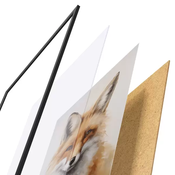Das Poster besteht aus einem Rahmen, Plexiglas, einem gedruckten Bild und einer Rückwand aus Spanplatten. Dank der Halterungen auf der Rückseite kann das Poster sofort an die Wand gehängt werden.