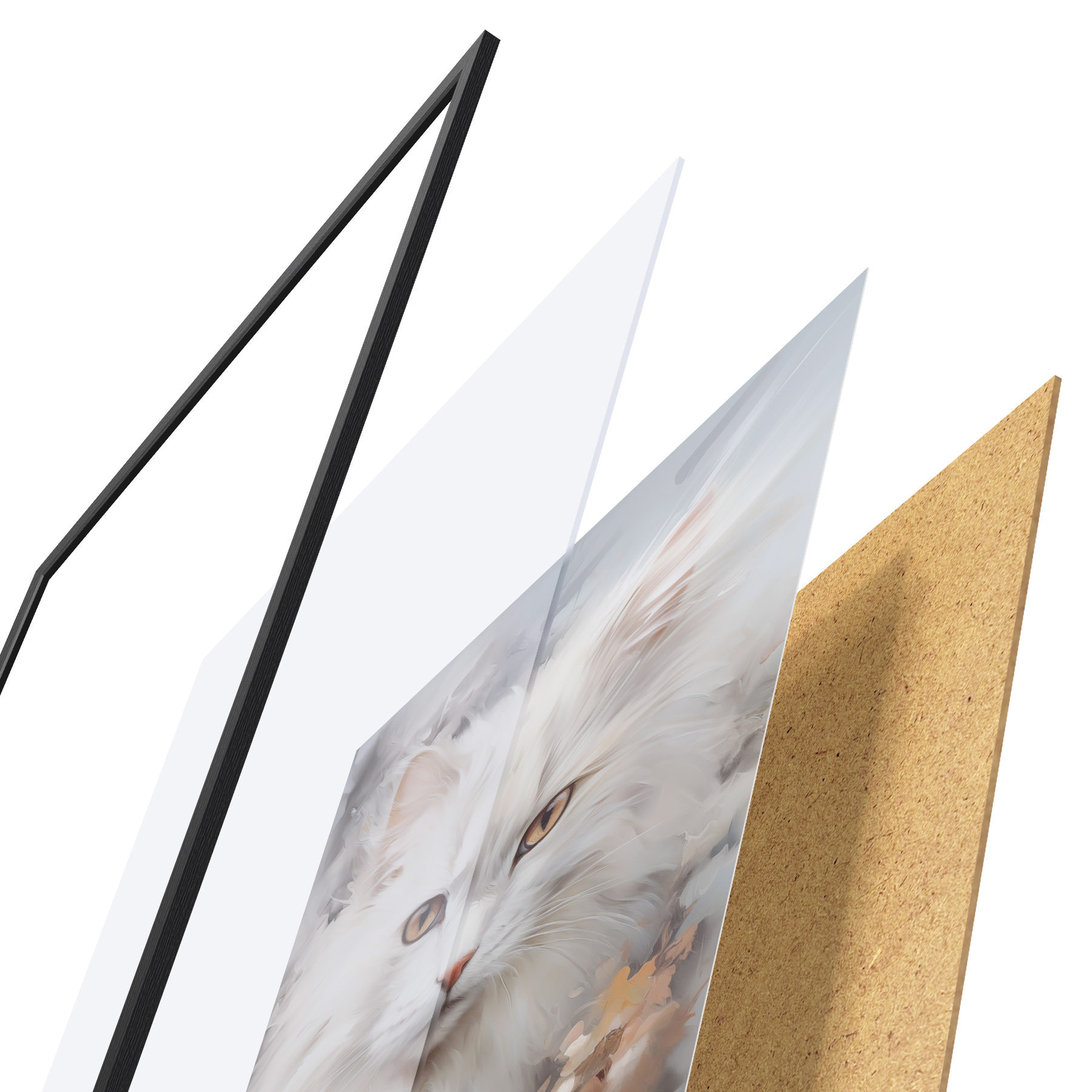 Das Poster besteht aus einem Rahmen, Plexiglas, einem gedruckten Bild und einer Rückwand aus Spanplatten. Dank der Halterungen auf der Rückseite kann das Poster sofort an die Wand gehängt werden.