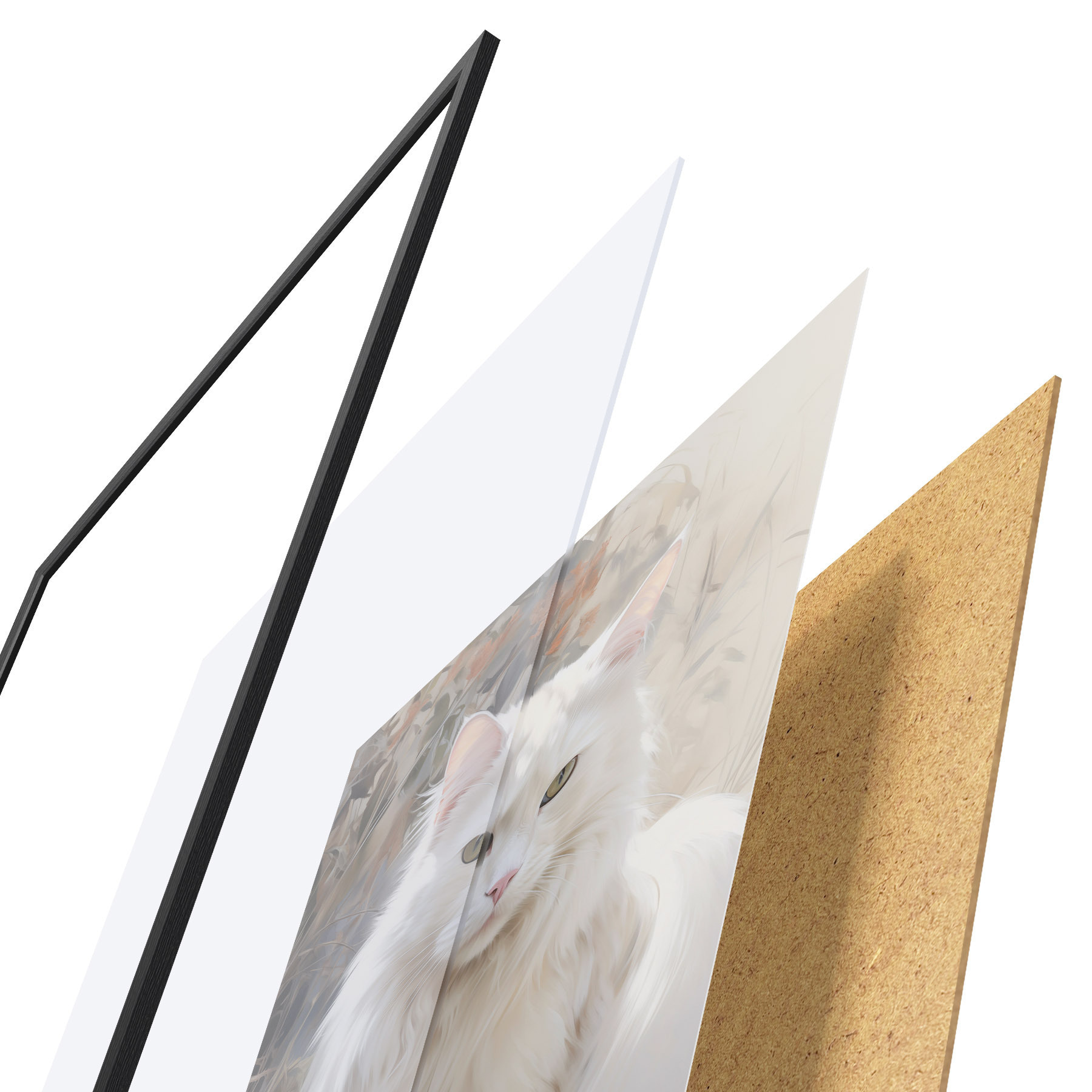 Das Poster besteht aus einem Rahmen, Plexiglas, einem gedruckten Bild und einer Rückwand aus Spanplatten. Dank der Halterungen auf der Rückseite kann das Poster sofort an die Wand gehängt werden.