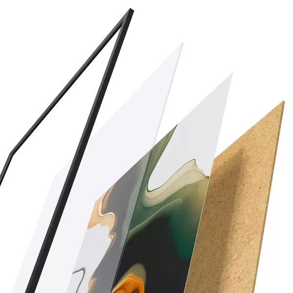 Das Poster besteht aus einem Rahmen, Plexiglas, einem gedruckten Bild und einer Rückwand aus Spanplatten. Dank der Halterungen auf der Rückseite kann das Poster sofort an die Wand gehängt werden.