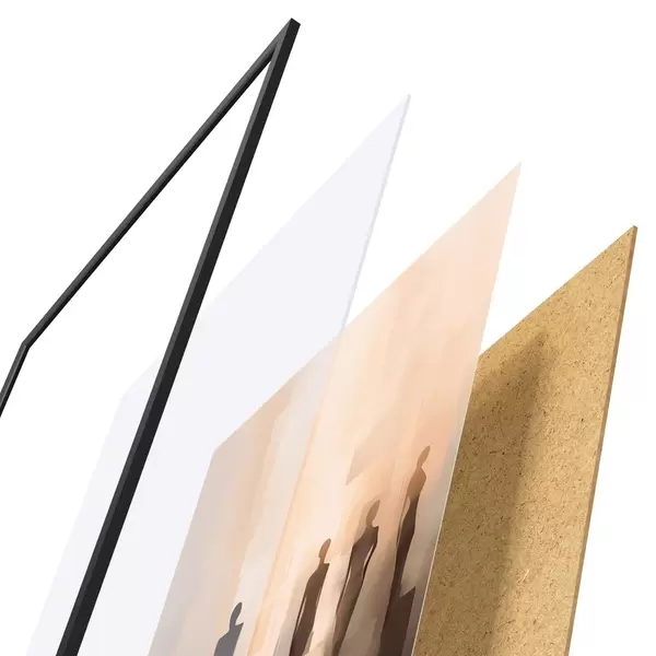 Das Poster besteht aus einem Rahmen, Plexiglas, einem gedruckten Bild und einer Rückwand aus Spanplatten. Dank der Halterungen auf der Rückseite kann das Poster sofort an die Wand gehängt werden.