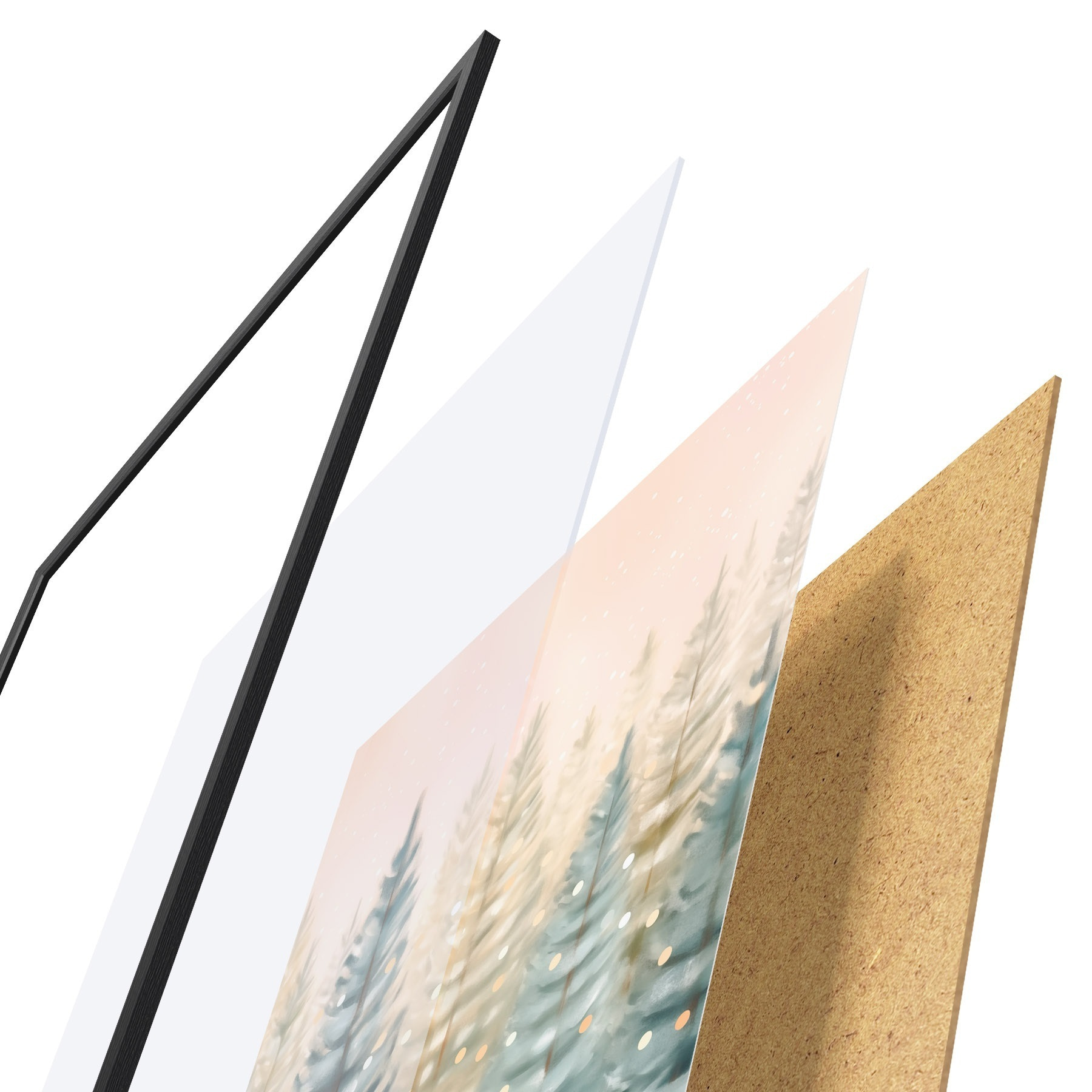 Das Poster besteht aus einem Rahmen, Plexiglas, einem gedruckten Bild und einer Rückwand aus Spanplatten. Dank der Halterungen auf der Rückseite kann das Poster sofort an die Wand gehängt werden.