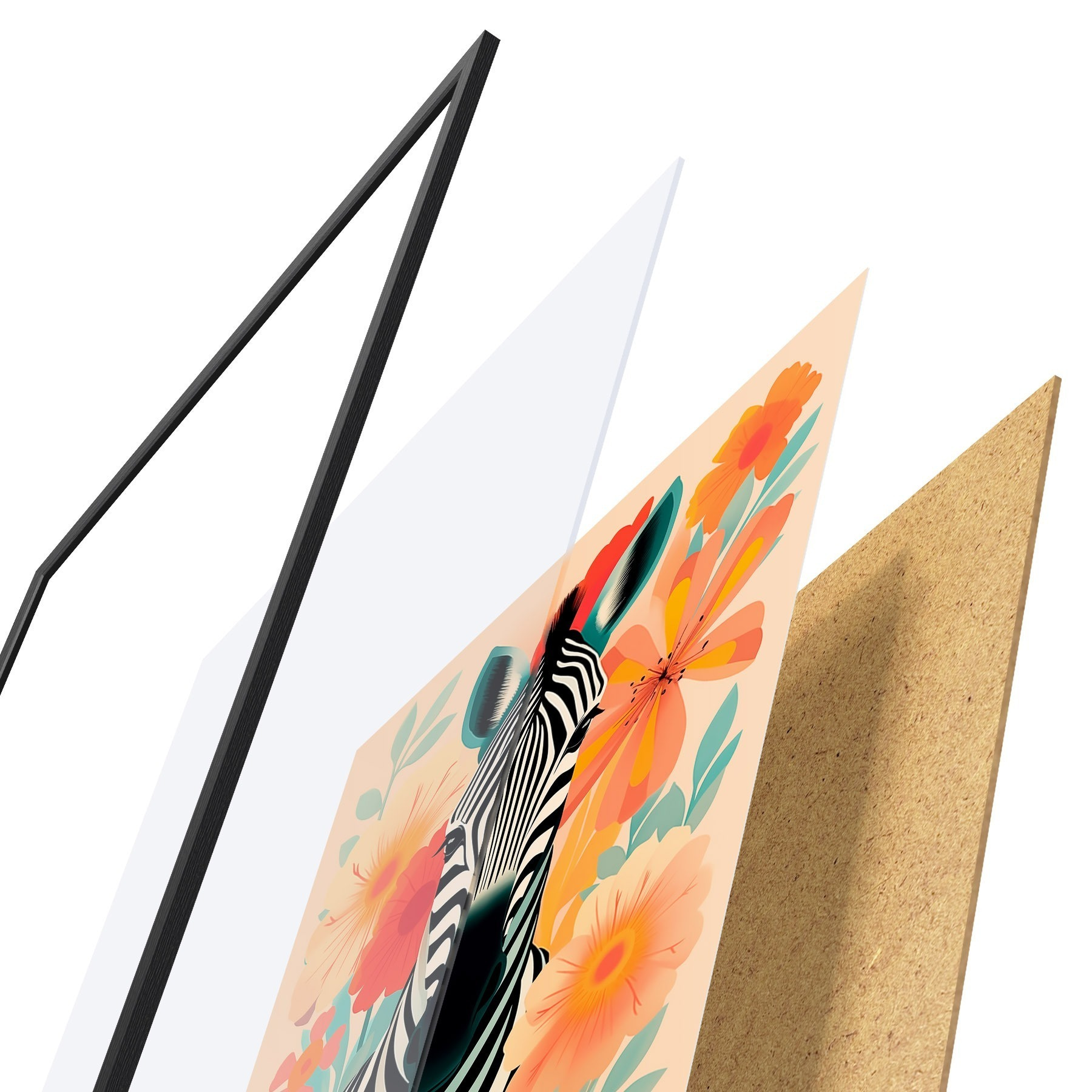 Das Poster besteht aus einem Rahmen, Plexiglas, einem gedruckten Bild und einer Rückwand aus Spanplatten. Dank der Halterungen auf der Rückseite kann das Poster sofort an die Wand gehängt werden.