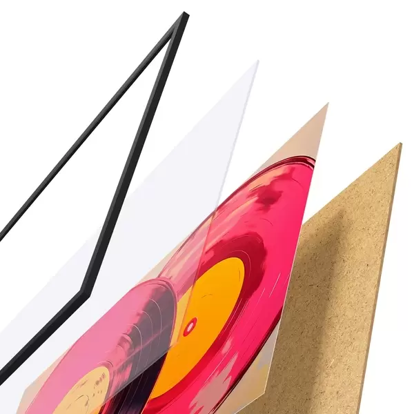 Das Poster besteht aus einem Rahmen, Plexiglas, einem gedruckten Bild und einer Rückwand aus Spanplatten. Dank der Halterungen auf der Rückseite kann das Poster sofort an die Wand gehängt werden.