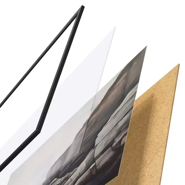 Das Poster besteht aus einem Rahmen, Plexiglas, einem gedruckten Bild und einer Rückwand aus Spanplatten. Dank der Halterungen auf der Rückseite kann das Poster sofort an die Wand gehängt werden.