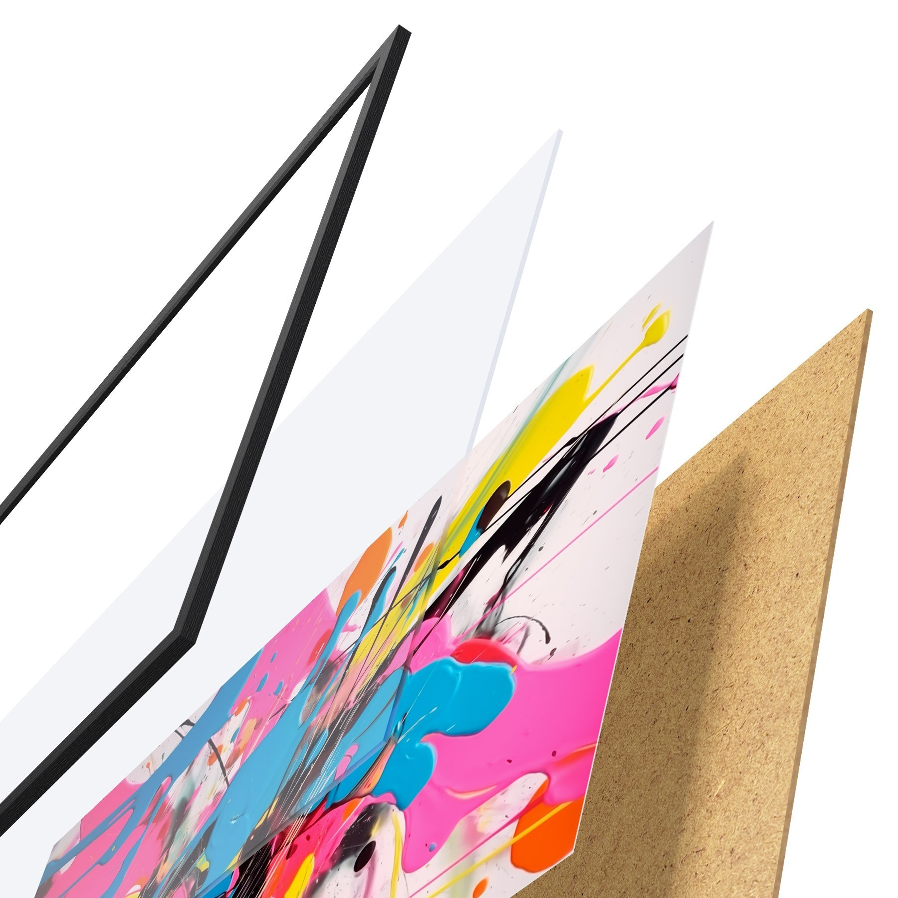 Das Poster besteht aus einem Rahmen, Plexiglas, einem gedruckten Bild und einer Rückwand aus Spanplatten. Dank der Halterungen auf der Rückseite kann das Poster sofort an die Wand gehängt werden.