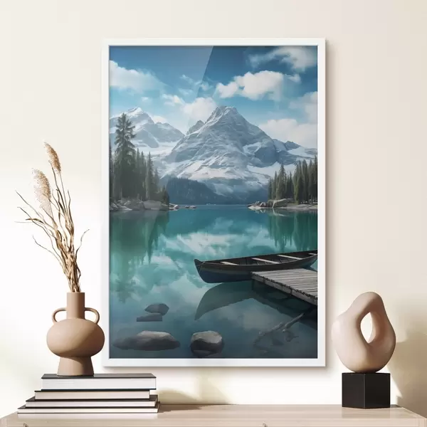 Poster Alpensee mit Kanu und schneebedeckten Gipfeln f46481
