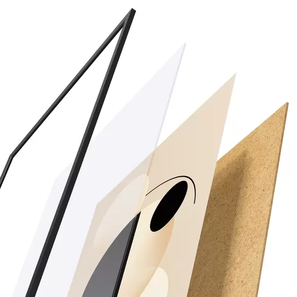 Das Poster besteht aus einem Rahmen, Plexiglas, einem gedruckten Bild und einer Rückwand aus Spanplatten. Dank der Halterungen auf der Rückseite kann das Poster sofort an die Wand gehängt werden.