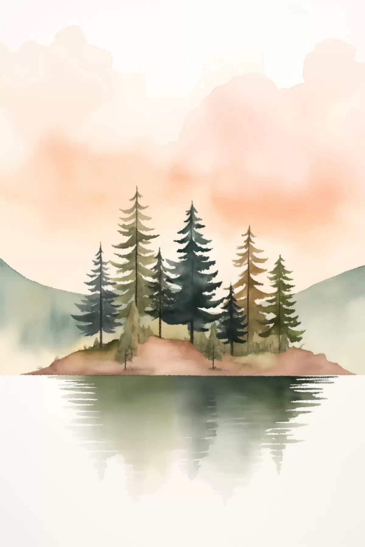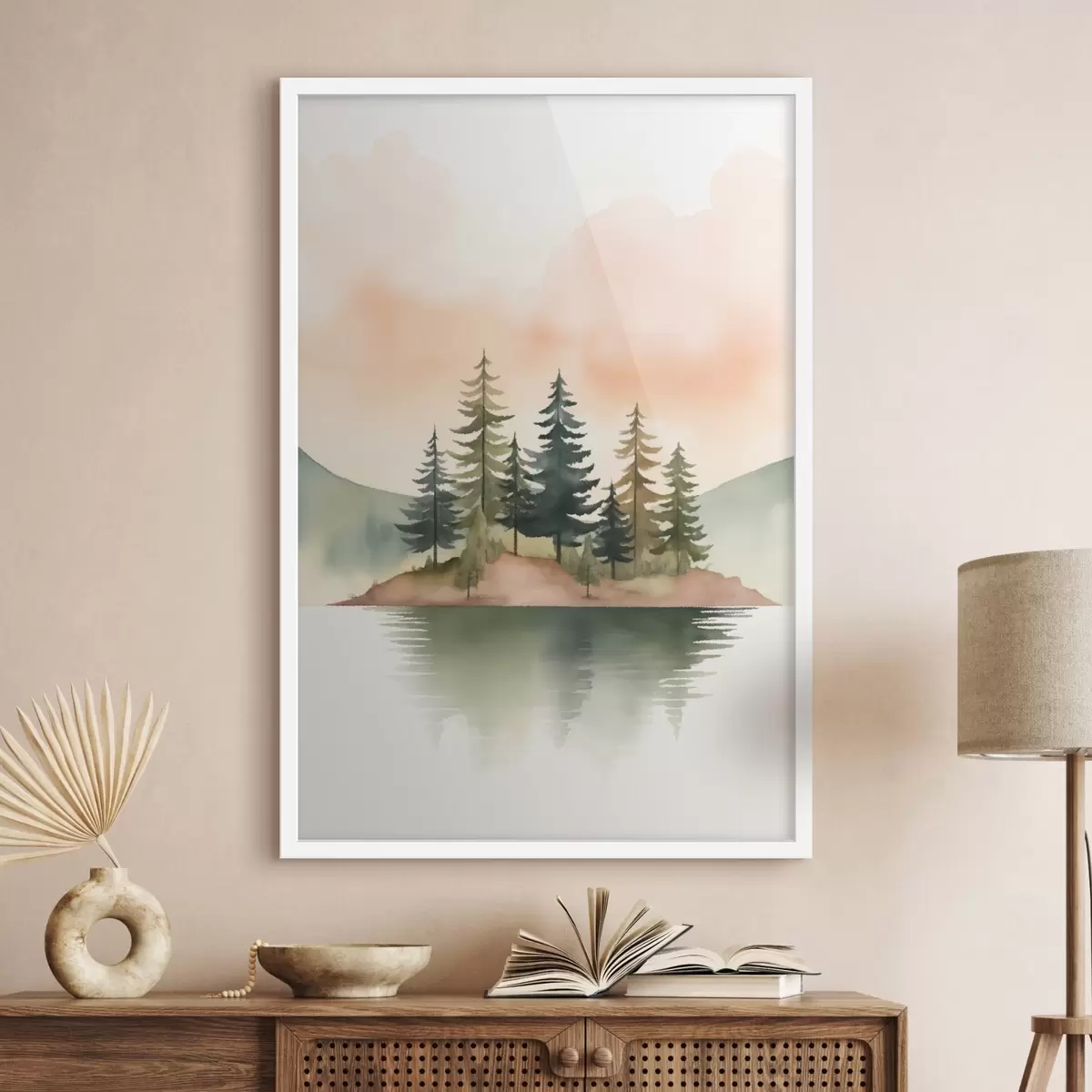 Poster Aquarellkiefern auf einer nebligen Insel, sanfter pfirsichfarbener Himmel Nr f46505