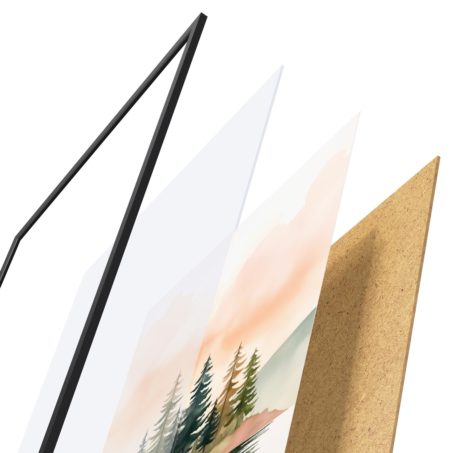 Das Poster besteht aus einem Rahmen, Plexiglas, einem gedruckten Bild und einer Rückwand aus Spanplatten. Dank der Halterungen auf der Rückseite kann das Poster sofort an die Wand gehängt werden.
