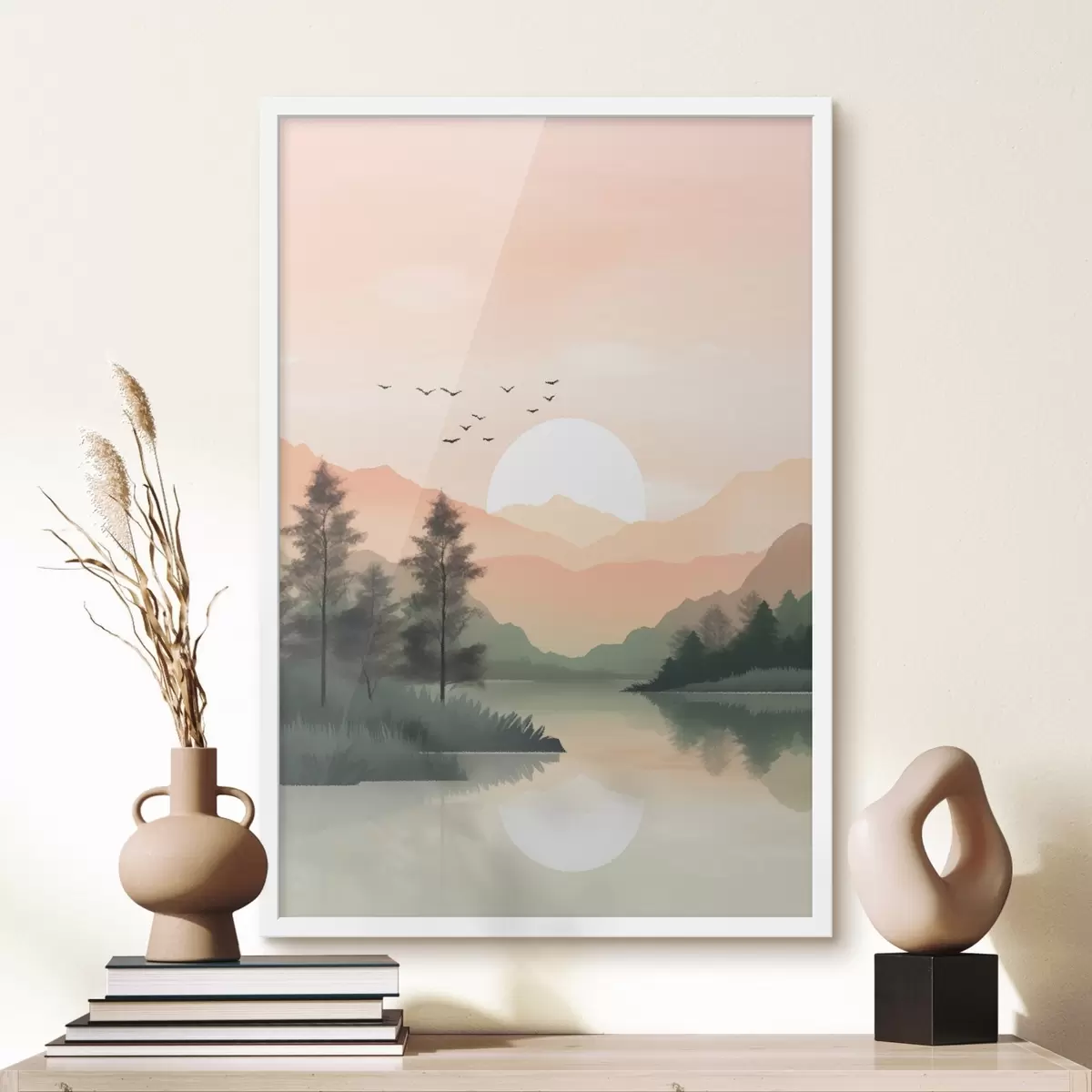 Poster Pastellfarbener Sonnenuntergang über einem ruhigen See mit fernen Hügeln und Vögeln Nr f46508