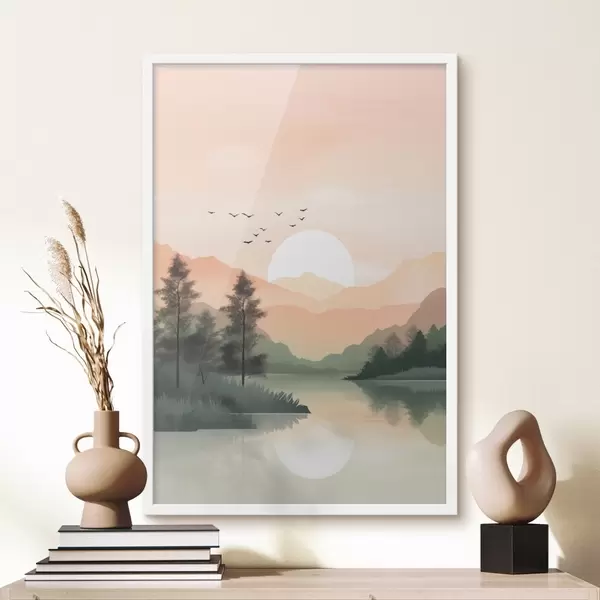 Poster Pastellfarbener Sonnenuntergang über einem ruhigen See mit fernen Hügeln und Vögeln f46508