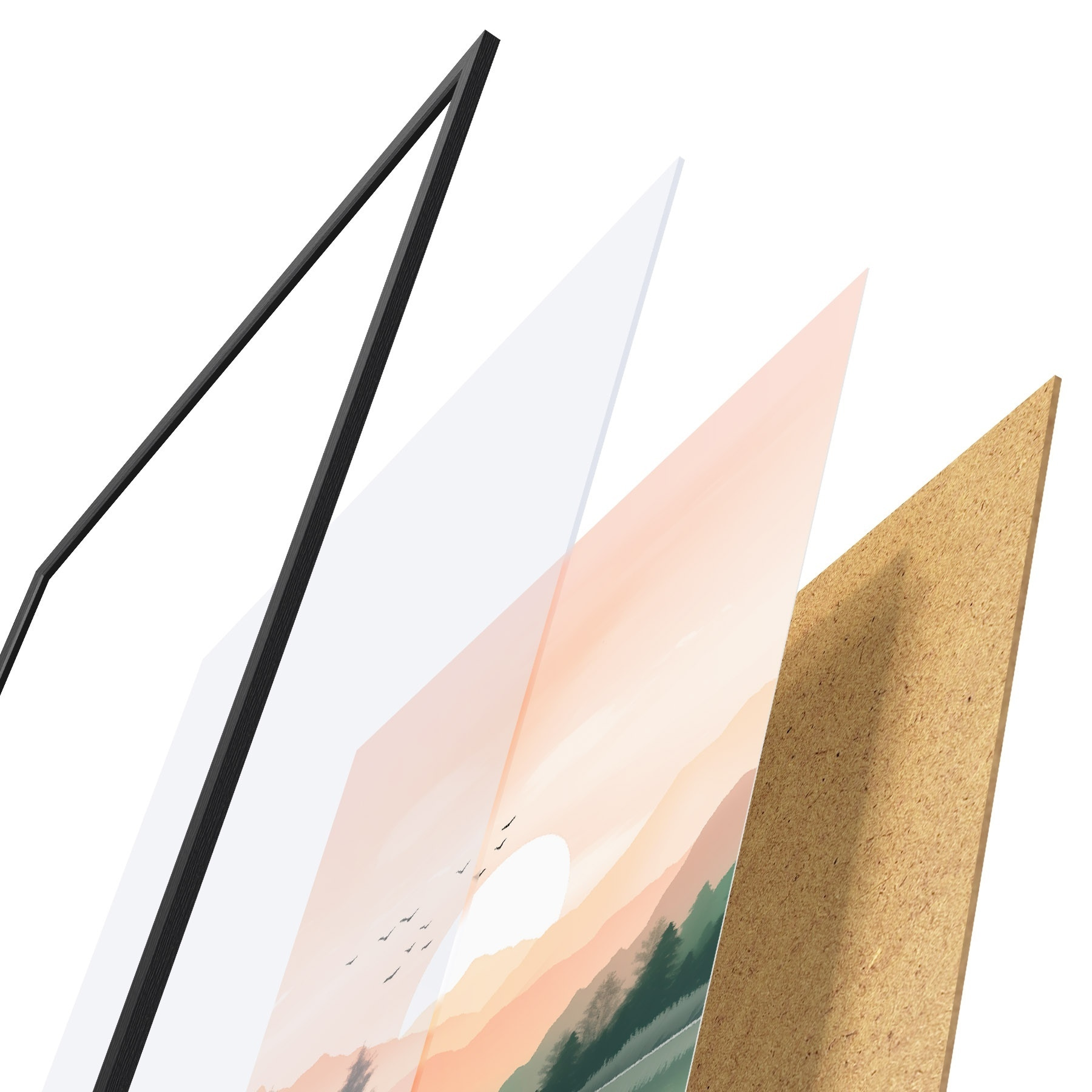 Das Poster besteht aus einem Rahmen, Plexiglas, einem gedruckten Bild und einer Rückwand aus Spanplatten. Dank der Halterungen auf der Rückseite kann das Poster sofort an die Wand gehängt werden.