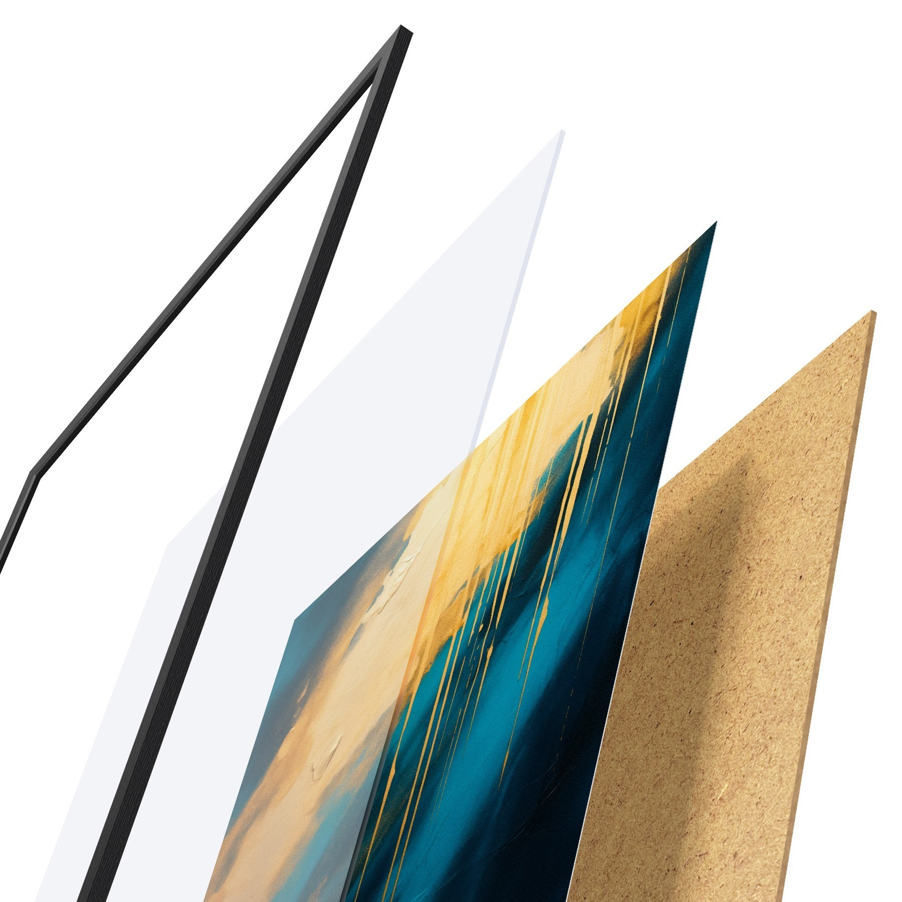 Das Poster besteht aus einem Rahmen, Plexiglas, einem gedruckten Bild und einer Rückwand aus Spanplatten. Dank der Halterungen auf der Rückseite kann das Poster sofort an die Wand gehängt werden.
