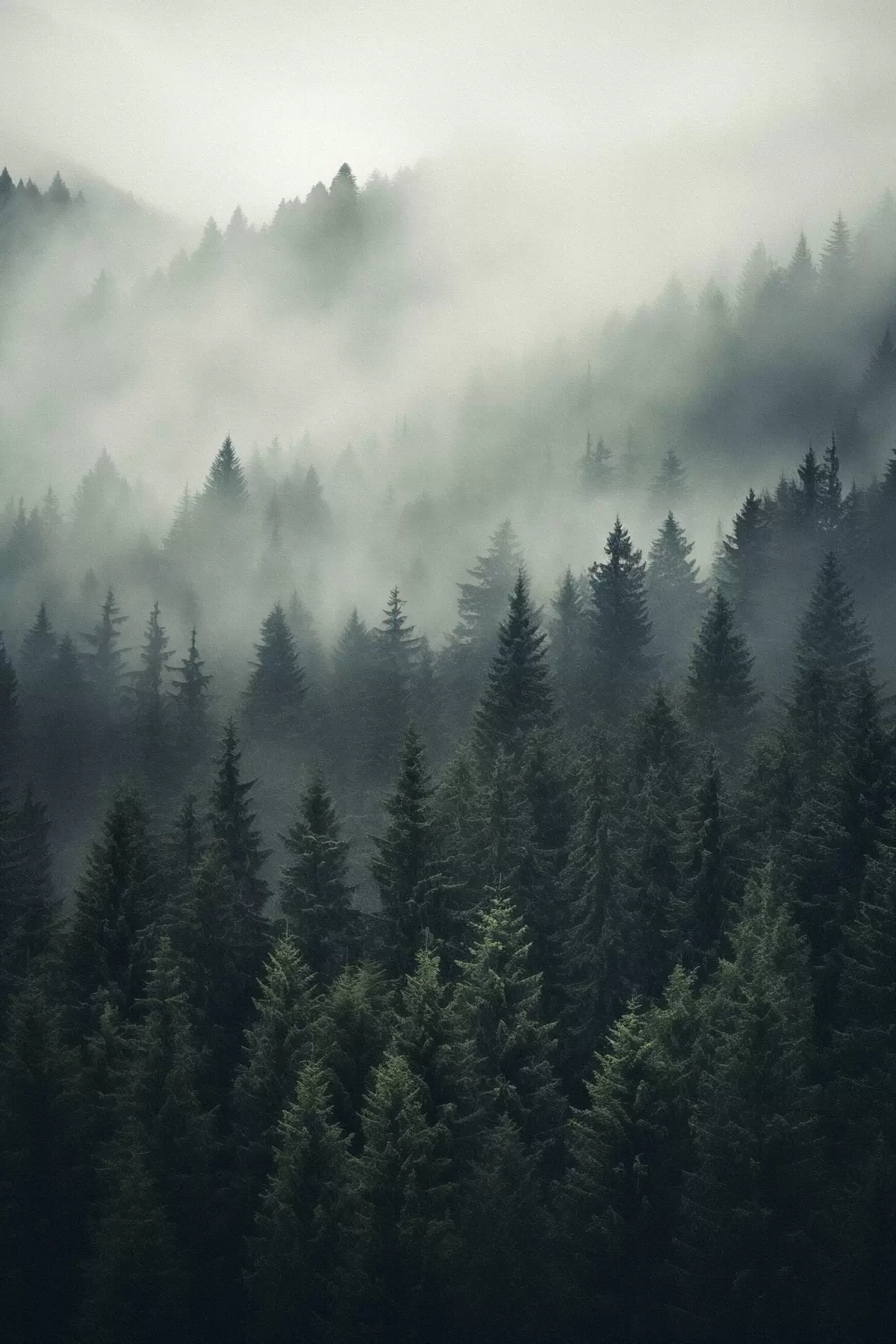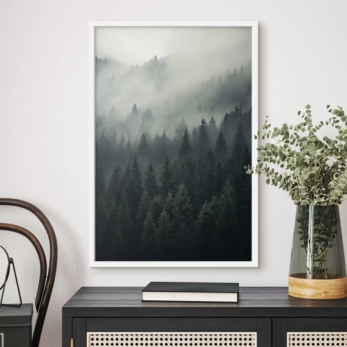 Poster Nebel zieht über dichten immergrünen Wald hinweg Nr f46512