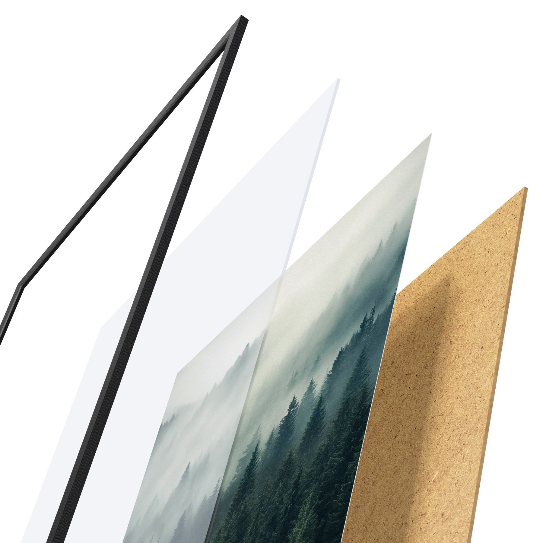 Das Poster besteht aus einem Rahmen, Plexiglas, einem gedruckten Bild und einer Rückwand aus Spanplatten. Dank der Halterungen auf der Rückseite kann das Poster sofort an die Wand gehängt werden.