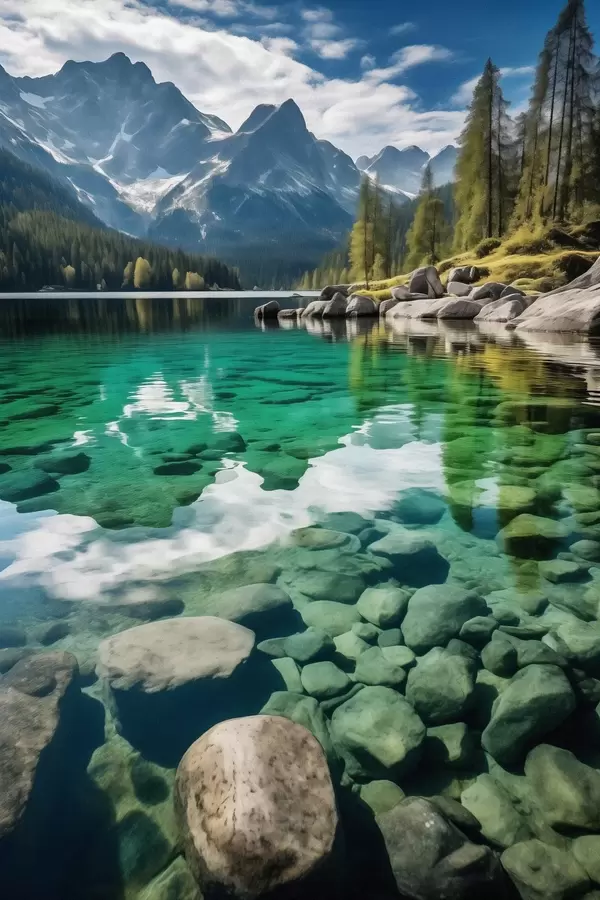 Poster Smaragdgrüner Alpensee mit Felsen darunter und hoch aufragenden Gipfeln Nr f46515