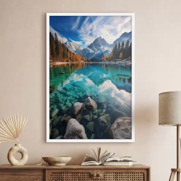 Poster Bergsee mit türkisfarbenem Wasser und herbstlichen Lärchen f46517