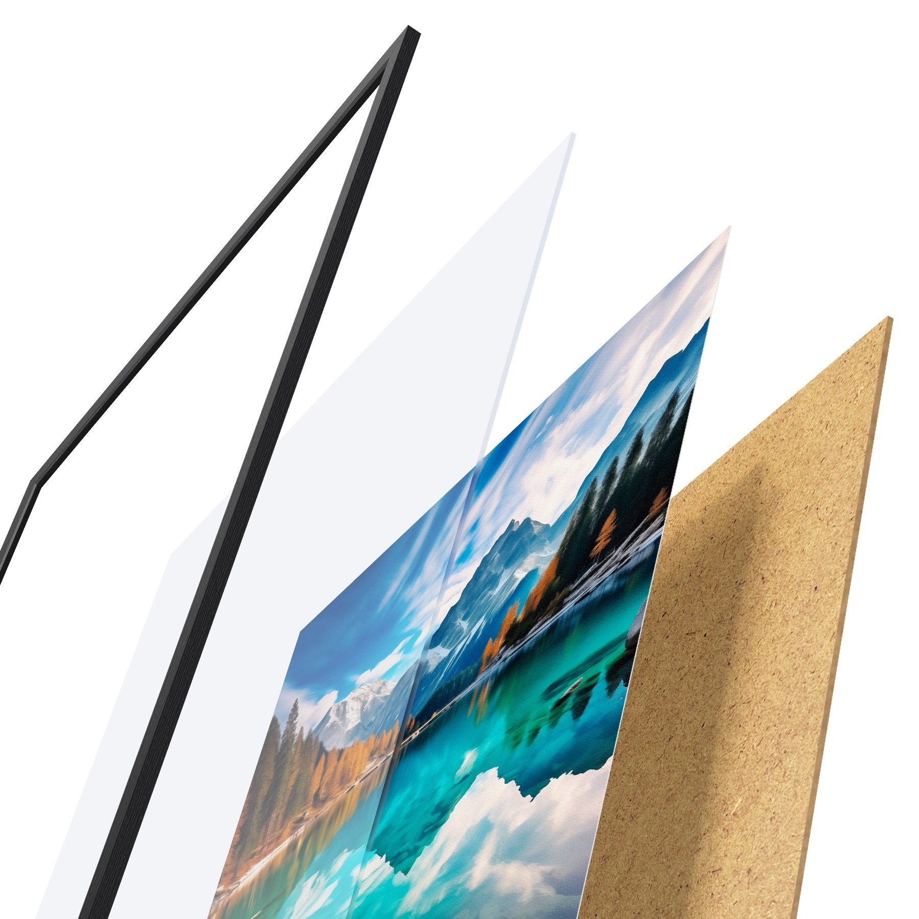 Das Poster besteht aus einem Rahmen, Plexiglas, einem gedruckten Bild und einer Rückwand aus Spanplatten. Dank der Halterungen auf der Rückseite kann das Poster sofort an die Wand gehängt werden.